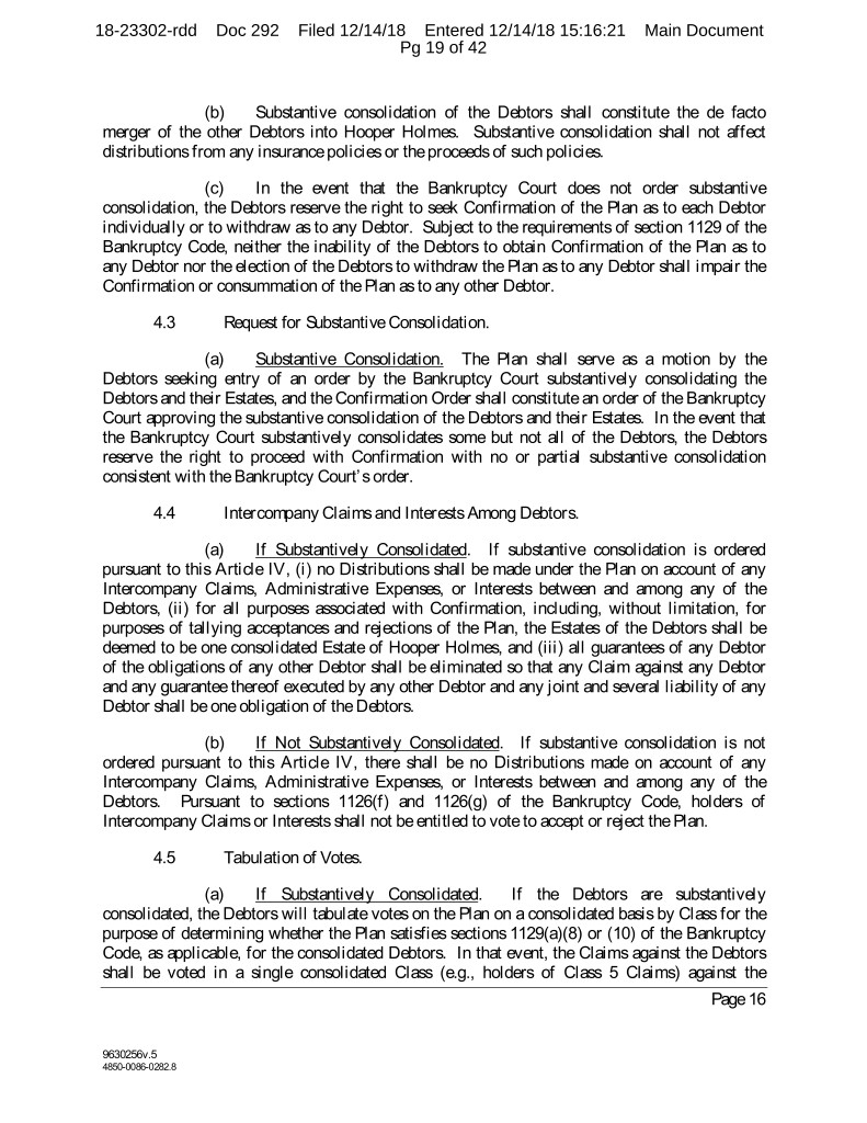 18-23302-rdd Doc 292 Filed 12/14/18 Entered 12/14/18 15:16:21 Main Document Pg 19 of 42 (b) Substantive consolidation of the Debtors shall constitute the de facto merger of the other Debtors into Hooper Holmes. Substantive consolidation shall not affect distributions from any insurance policies or the proceeds of such policies. (c) In the event that the Bankruptcy Court does not order substantive consolidation, the Debtors reserve the right to seek Confirmation of the Plan as to each Debtor individually or to withdraw as to any Debtor. Subject to the requirements of section 1129 of the Bankruptcy Code, neither the inability of the Debtors to obtain Confirmation of the Plan as to any Debtor nor the election of the Debtors to withdraw the Plan as to any Debtor shall impair the Confirmation or consummation of the Plan as to any other Debtor. 4.3 Request for Substantive Consolidation. (a) Substantive Consolidation. The Plan shall serve as a motion by the Debtors seeking entry of an order by the Bankruptcy Court substantively consolidating the Debtors and their Estates, and the Confirmation Order shall constitute an order of the Bankruptcy Court approving the substantive consolidation of the Debtors and their Estates. In the event that the Bankruptcy Court substantively consolidates some but not all of the Debtors, the Debtors reserve the right to proceed with Confirmation with no or partial substantive consolidation consistent with the Bankruptcy Court’s order. 4.4 Intercompany Claims and Interests Among Debtors. (a) If Substantively Consolidated. If substantive consolidation is ordered pursuant to this Article IV, (i) no Distributions shall be made under the Plan on account of any Intercompany Claims, Administrative Expenses, or Interests between and among any of the Debtors, (ii) for all purposes associated with Confirmation, including, without limitation, for purposes of tallying acceptances and rejections of the Plan, the Estates of the Debtors shall be deemed to be one consolidated Estate of Hooper Holmes, and (iii) all guarantees of any Debtor of the obligations of any other Debtor shall be eliminated so that any Claim against any Debtor and any guarantee thereof executed by any other Debtor and any joint and several liability of any Debtor shall be one obligation of the Debtors. (b) If Not Substantively Consolidated. If substantive consolidation is not ordered pursuant to this Article IV, there shall be no Distributions made on account of any Intercompany Claims, Administrative Expenses, or Interests between and among any of the Debtors. Pursuant to sections 1126(f) and 1126(g) of the Bankruptcy Code, holders of Intercompany Claims or Interests shall not be entitled to vote to accept or reject the Plan. 4.5 Tabulation of Votes. (a) If Substantively Consolidated. If the Debtors are substantively consolidated, the Debtors will tabulate votes on the Plan on a consolidated basis by Class for the purpose of determining whether the Plan satisfies sections 1129(a)(8) or (10) of the Bankruptcy Code, as applicable, for the consolidated Debtors. In that event, the Claims against the Debtors shall be voted in a single consolidated Class (e.g., holders of Class 5 Claims) against the Page 16 9630256v.5 4850-0086-0282.8