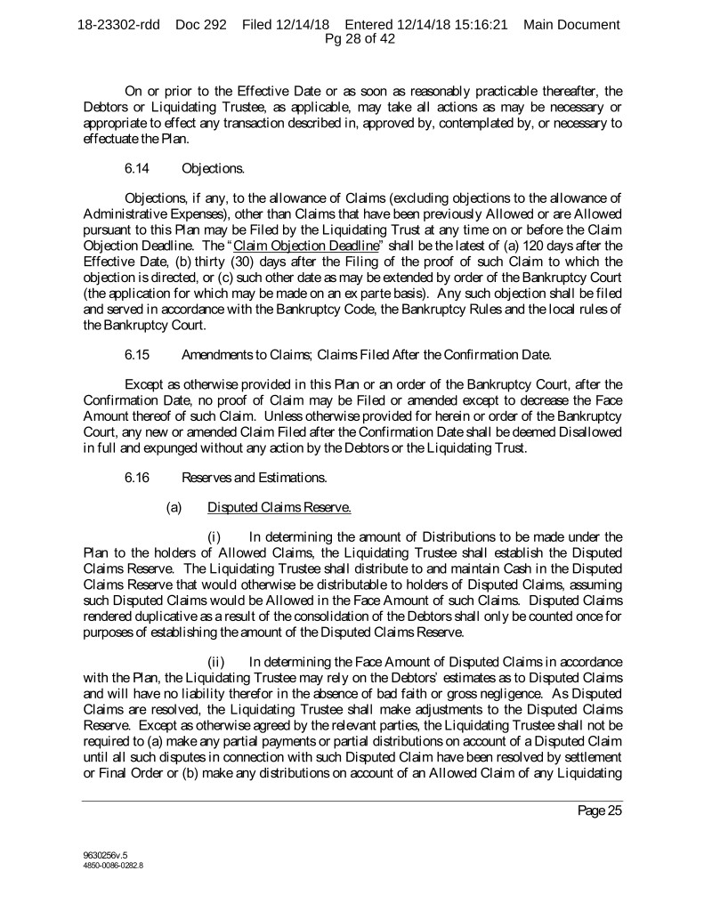 18-23302-rdd Doc 292 Filed 12/14/18 Entered 12/14/18 15:16:21 Main Document Pg 28 of 42 On or prior to the Effective Date or as soon as reasonably practicable thereafter, the Debtors or Liquidating Trustee, as applicable, may take all actions as may be necessary or appropriate to effect any transaction described in, approved by, contemplated by, or necessary to effectuate the Plan. 6.14 Objections. Objections, if any, to the allowance of Claims (excluding objections to the allowance of Administrative Expenses), other than Claims that have been previously Allowed or are Allowed pursuant to this Plan may be Filed by the Liquidating Trust at any time on or before the Claim Objection Deadline. The “Claim Objection Deadline” shall be the latest of (a) 120 days after the Effective Date, (b) thirty (30) days after the Filing of the proof of such Claim to which the objection is directed, or (c) such other date as may be extended by order of the Bankruptcy Court (the application for which may be made on an ex parte basis). Any such objection shall be filed and served in accordance with the Bankruptcy Code, the Bankruptcy Rules and the local rules of the Bankruptcy Court. 6.15 Amendments to Claims; Claims Filed After the Confirmation Date. Except as otherwise provided in this Plan or an order of the Bankruptcy Court, after the Confirmation Date, no proof of Claim may be Filed or amended except to decrease the Face Amount thereof of such Claim. Unless otherwise provided for herein or order of the Bankruptcy Court, any new or amended Claim Filed after the Confirmation Date shall be deemed Disallowed in full and expunged without any action by the Debtors or the Liquidating Trust. 6.16 Reserves and Estimations. (a) Disputed Claims Reserve. (i) In determining the amount of Distributions to be made under the Plan to the holders of Allowed Claims, the Liquidating Trustee shall establish the Disputed Claims Reserve. The Liquidating Trustee shall distribute to and maintain Cash in the Disputed Claims Reserve that would otherwise be distributable to holders of Disputed Claims, assuming such Disputed Claims would be Allowed in the Face Amount of such Claims. Disputed Claims rendered duplicative as a result of the consolidation of the Debtors shall only be counted once for purposes of establishing the amount of the Disputed Claims Reserve. (ii) In determining the Face Amount of Disputed Claims in accordance with the Plan, the Liquidating Trustee may rely on the Debtors’ estimates as to Disputed Claims and will have no liability therefor in the absence of bad faith or gross negligence. As Disputed Claims are resolved, the Liquidating Trustee shall make adjustments to the Disputed Claims Reserve. Except as otherwise agreed by the relevant parties, the Liquidating Trustee shall not be required to (a) make any partial payments or partial distributions on account of a Disputed Claim until all such disputes in connection with such Disputed Claim have been resolved by settlement or Final Order or (b) make any distributions on account of an Allowed Claim of any Liquidating Page 25 9630256v.5 4850-0086-0282.8