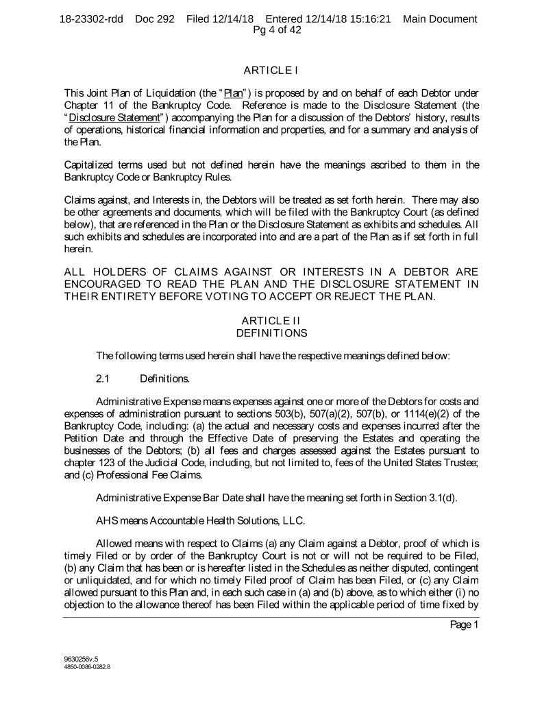 18-23302-rdd Doc 292 Filed 12/14/18 Entered 12/14/18 15:16:21 Main Document Pg 4 of 42 ARTICLE I This Joint Plan of Liquidation (the “Plan”) is proposed by and on behalf of each Debtor under Chapter 11 of the Bankruptcy Code. Reference is made to the Disclosure Statement (the “Disclosure Statement”) accompanying the Plan for a discussion of the Debtors’ history, results of operations, historical financial information and properties, and for a summary and analysis of the Plan. Capitalized terms used but not defined herein have the meanings ascribed to them in the Bankruptcy Code or Bankruptcy Rules. Claims against, and Interests in, the Debtors will be treated as set forth herein. There may also be other agreements and documents, which will be filed with the Bankruptcy Court (as defined below), that are referenced in the Plan or the Disclosure Statement as exhibits and schedules. All such exhibits and schedules are incorporated into and are a part of the Plan as if set forth in full herein. ALL HOLDERS OF CLAIMS AGAINST OR INTERESTS IN A DEBTOR ARE ENCOURAGED TO READ THE PLAN AND THE DISCLOSURE STATEMENT IN THEIR ENTIRETY BEFORE VOTING TO ACCEPT OR REJECT THE PLAN. ARTICLE II DEFINITIONS The following terms used herein shall have the respective meanings defined below: 2.1 Definitions. Administrative Expense means expenses against one or more of the Debtors for costs and expenses of administration pursuant to sections 503(b), 507(a)(2), 507(b), or 1114(e)(2) of the Bankruptcy Code, including: (a) the actual and necessary costs and expenses incurred after the Petition Date and through the Effective Date of preserving the Estates and operating the businesses of the Debtors; (b) all fees and charges assessed against the Estates pursuant to chapter 123 of the Judicial Code, including, but not limited to, fees of the United States Trustee; and (c) Professional Fee Claims. Administrative Expense Bar Date shall have the meaning set forth in Section 3.1(d). AHS means Accountable Health Solutions, LLC. Allowed means with respect to Claims (a) any Claim against a Debtor, proof of which is timely Filed or by order of the Bankruptcy Court is not or will not be required to be Filed, (b) any Claim that has been or is hereafter listed in the Schedules as neither disputed, contingent or unliquidated, and for which no timely Filed proof of Claim has been Filed, or (c) any Claim allowed pursuant to this Plan and, in each such case in (a) and (b) above, as to which either (i) no objection to the allowance thereof has been Filed within the applicable period of time fixed by Page 1 9630256v.5 4850-0086-0282.8