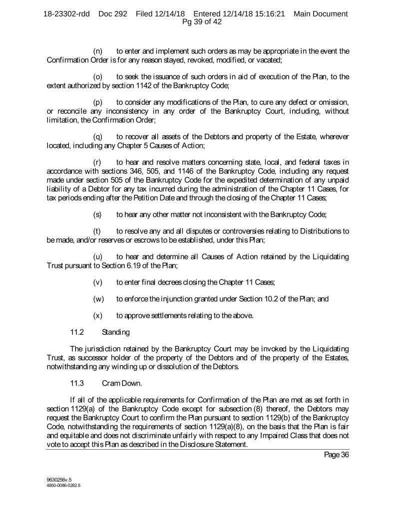 18-23302-rdd Doc 292 Filed 12/14/18 Entered 12/14/18 15:16:21 Main Document Pg 39 of 42 (n) to enter and implement such orders as may be appropriate in the event the Confirmation Order is for any reason stayed, revoked, modified, or vacated; (o) to seek the issuance of such orders in aid of execution of the Plan, to the extent authorized by section 1142 of the Bankruptcy Code; (p) to consider any modifications of the Plan, to cure any defect or omission, or reconcile any inconsistency in any order of the Bankruptcy Court, including, without limitation, the Confirmation Order; (q) to recover all assets of the Debtors and property of the Estate, wherever located, including any Chapter 5 Causes of Action; (r) to hear and resolve matters concerning state, local, and federal taxes in accordance with sections 346, 505, and 1146 of the Bankruptcy Code, including any request made under section 505 of the Bankruptcy Code for the expedited determination of any unpaid liability of a Debtor for any tax incurred during the administration of the Chapter 11 Cases, for tax periods ending after the Petition Date and through the closing of the Chapter 11 Cases; (s) to hear any other matter not inconsistent with the Bankruptcy Code; (t) to resolve any and all disputes or controversies relating to Distributions to be made, and/or reserves or escrows to be established, under this Plan; (u) to hear and determine all Causes of Action retained by the Liquidating Trust pursuant to Section 6.19 of the Plan; (v) to enter final decrees closing the Chapter 11 Cases; (w) to enforce the injunction granted under Section 10.2 of the Plan; and (x) to approve settlements relating to the above. 11.2 Standing The jurisdiction retained by the Bankruptcy Court may be invoked by the Liquidating Trust, as successor holder of the property of the Debtors and of the property of the Estates, notwithstanding any winding up or dissolution of the Debtors. 11.3 Cram Down. If all of the applicable requirements for Confirmation of the Plan are met as set forth in section 1129(a) of the Bankruptcy Code except for subsection (8) thereof, the Debtors may request the Bankruptcy Court to confirm the Plan pursuant to section 1129(b) of the Bankruptcy Code, notwithstanding the requirements of section 1129(a)(8), on the basis that the Plan is fair and equitable and does not discriminate unfairly with respect to any Impaired Class that does not vote to accept this Plan as described in the Disclosure Statement. Page 36 9630256v.5 4850-0086-0282.8