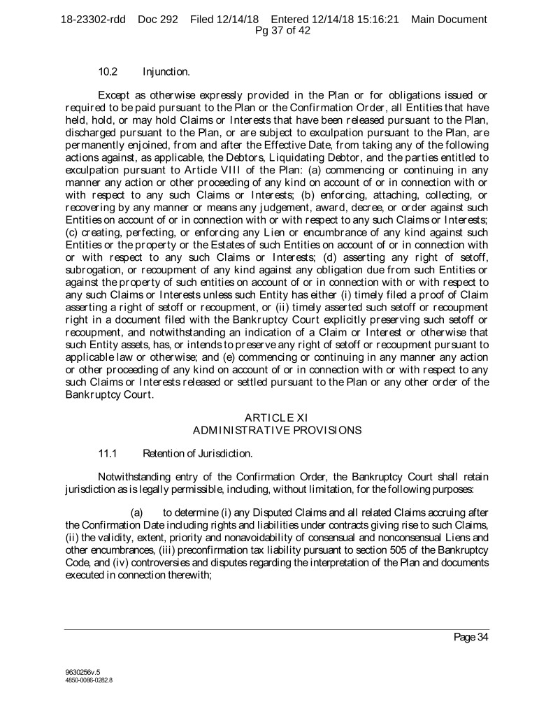 18-23302-rdd Doc 292 Filed 12/14/18 Entered 12/14/18 15:16:21 Main Document Pg 37 of 42 10.2 Injunction. Except as otherwise expressly provided in the Plan or for obligations issued or required to be paid pursuant to the Plan or the Confirmation Order, all Entities that have held, hold, or may hold Claims or Interests that have been released pursuant to the Plan, discharged pursuant to the Plan, or are subject to exculpation pursuant to the Plan, are permanently enjoined, from and after the Effective Date, from taking any of the following actions against, as applicable, the Debtors, Liquidating Debtor, and the parties entitled to exculpation pursuant to Article VIII of the Plan: (a) commencing or continuing in any manner any action or other proceeding of any kind on account of or in connection with or with respect to any such Claims or Interests; (b) enforcing, attaching, collecting, or recovering by any manner or means any judgement, award, decree, or order against such Entities on account of or in connection with or with respect to any such Claims or Interests; (c) creating, perfecting, or enforcing any Lien or encumbrance of any kind against such Entities or the property or the Estates of such Entities on account of or in connection with or with respect to any such Claims or Interests; (d) asserting any right of setoff, subrogation, or recoupment of any kind against any obligation due from such Entities or against the property of such entities on account of or in connection with or with respect to any such Claims or Interests unless such Entity has either (i) timely filed a proof of Claim asserting a right of setoff or recoupment, or (ii) timely asserted such setoff or recoupment right in a document filed with the Bankruptcy Court explicitly preserving such setoff or recoupment, and notwithstanding an indication of a Claim or Interest or otherwise that such Entity assets, has, or intends to preserve any right of setoff or recoupment pursuant to applicable law or otherwise; and (e) commencing or continuing in any manner any action or other proceeding of any kind on account of or in connection with or with respect to any such Claims or Interests released or settled pursuant to the Plan or any other order of the Bankruptcy Court. ARTICLE XI ADMINISTRATIVE PROVISIONS 11.1 Retention of Jurisdiction. Notwithstanding entry of the Confirmation Order, the Bankruptcy Court shall retain jurisdiction as is legally permissible, including, without limitation, for the following purposes: (a) to determine (i) any Disputed Claims and all related Claims accruing after the Confirmation Date including rights and liabilities under contracts giving rise to such Claims, (ii) the validity, extent, priority and nonavoidability of consensual and nonconsensual Liens and other encumbrances, (iii) preconfirmation tax liability pursuant to section 505 of the Bankruptcy Code, and (iv) controversies and disputes regarding the interpretation of the Plan and documents executed in connection therewith; Page 34 9630256v.5 4850-0086-0282.8