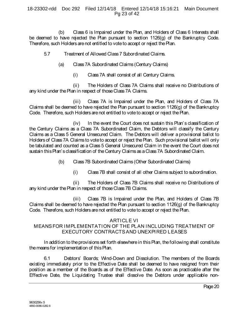 18-23302-rdd Doc 292 Filed 12/14/18 Entered 12/14/18 15:16:21 Main Document Pg 23 of 42 (b) Class 6 is Impaired under the Plan, and Holders of Class 6 Interests shall be deemed to have rejected the Plan pursuant to section 1126(g) of the Bankruptcy Code. Therefore, such Holders are not entitled to vote to accept or reject the Plan. 5.7 Treatment of Allowed Class 7 Subordinated Claims. (a) Class 7A Subordinated Claims (Century Claims) (i) Class 7A shall consist of all Century Claims. (ii) The Holders of Class 7A Claims shall receive no Distributions of any kind under the Plan in respect of those Class 7A Claims. (iii) Class 7A is Impaired under the Plan, and Holders of Class 7A Claims shall be deemed to have rejected the Plan pursuant to section 1126(g) of the Bankruptcy Code. Therefore, such Holders are not entitled to vote to accept or reject the Plan. (iv) In the event the Court does not sustain this Plan’s classification of the Century Claims as a Class 7A Subordinated Claim, the Debtors will classify the Century Claims as a Class 5 General Unsecured Claim. The Debtors will deliver a provisional ballot to Holders of Class 7A Claims to vote to accept or reject the Plan. Such provisional ballot will only be tabulated and counted as a Class 5 General Unsecured Claim in the event the Court does not sustain this Plan’s classification of the Century Claims as a Class 7A Subordinated Claim. (b) Class 7B Subordinated Claims (Other Subordinated Claims) (i) Class 7B shall consist of all other Claims subject to subordination. (ii) The Holders of Class 7B Claims shall receive no Distributions of any kind under the Plan in respect of those Class 7B Claims. (iii) Class 7B is Impaired under the Plan, and Holders of Class 7B Claims shall be deemed to have rejected the Plan pursuant to section 1126(g) of the Bankruptcy Code. Therefore, such Holders are not entitled to vote to accept or reject the Plan. ARTICLE VI MEANS FOR IMPLEMENTATION OF THE PLAN INCLUDING TREATMENT OF EXECUTORY CONTRACTS AND UNEXPIRED LEASES In addition to the provisions set forth elsewhere in this Plan, the following shall constitute the means for implementation of this Plan. 6.1 Debtors’ Boards; Wind-Down and Dissolution. The members of the Boards existing immediately prior to the Effective Date shall be deemed to have resigned from their position as a member of the Boards as of the Effective Date. As soon as practicable after the Effective Date, the Liquidating Trustee shall dissolve the Debtors under applicable non- Page 20 9630256v.5 4850-0086-0282.8