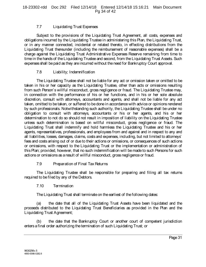 18-23302-rdd Doc 292 Filed 12/14/18 Entered 12/14/18 15:16:21 Main Document Pg 34 of 42 7.7 Liquidating Trust Expenses Subject to the provisions of the Liquidating Trust Agreement, all costs, expenses and obligations incurred by the Liquidating Trustee in administering this Plan, the Liquidating Trust, or in any manner connected, incidental or related thereto, in effecting distributions from the Liquidating Trust thereunder (including the reimbursement of reasonable expenses) shall be a charge against the Liquidating Trust Administrative Expenses Reserve remaining from time to time in the hands of the Liquidating Trustee and second, from the Liquidating Trust Assets. Such expenses shall be paid as they are incurred without the need for Bankruptcy Court approval. 7.8 Liability; Indemnification The Liquidating Trustee shall not be liable for any act or omission taken or omitted to be taken in his or her capacity as the Liquidating Trustee, other than acts or omissions resulting from such Person’s willful misconduct, gross negligence or fraud. The Liquidating Trustee may, in connection with the performance of his or her functions, and in his or her sole absolute discretion, consult with attorneys, accountants and agents, and shall not be liable for any act taken, omitted to be taken, or suffered to be done in accordance with advice or opinions rendered by such professionals. Notwithstanding such authority, the Liquidating Trustee shall be under no obligation to consult with attorneys, accountants or his or her agents, and his or her determination to not do so should not result in imposition of liability on the Liquidating Trustee unless such determination is based on willful misconduct, gross negligence or fraud. The Liquidating Trust shall indemnify and hold harmless the Liquidating Trustee and his or her agents, representatives, professionals, and employees from and against and in respect to any and all liabilities, losses, damages, claims, costs and expenses, including, but not limited to attorneys’ fees and costs arising out of or due to their actions or omissions, or consequences of such actions or omissions, with respect to the Liquidating Trust or the implementation or administration of this Plan; provided, however, that no such indemnification will be made to such Persons for such actions or omissions as a result of willful misconduct, gross negligence or fraud. 7.9 Preparation of Final Tax Returns The Liquidating Trustee shall be responsible for preparing and filing all tax returns required to be filed by any of the Debtors. 7.10 Termination The Liquidating Trust shall terminate on the earliest of the following dates: (a) the date that all of the Liquidating Trust Assets have been liquidated and the proceeds distributed to the Liquidating Trust Beneficiaries as provided in the Plan and the Liquidating Trust Agreement; (b) the date that the Bankruptcy Court or another court of competent jurisdiction enters a final order authorizing the termination of such Liquidating Trust; or Page 31 9630256v.5 4850-0086-0282.8