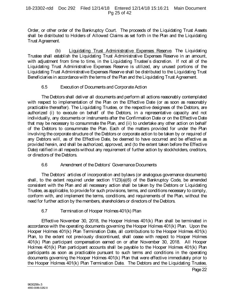 18-23302-rdd Doc 292 Filed 12/14/18 Entered 12/14/18 15:16:21 Main Document Pg 25 of 42 Order, or other order of the Bankruptcy Court. The proceeds of the Liquidating Trust Assets shall be distributed to Holders of Allowed Claims as set forth in the Plan and the Liquidating Trust Agreement. (b) Liquidating Trust Administrative Expenses Reserve. The Liquidating Trustee shall establish the Liquidating Trust Administrative Expenses Reserve in an amount, with adjustment from time to time, in the Liquidating Trustee’s discretion. If not all of the Liquidating Trust Administrative Expenses Reserve is utilized, any unused portions of the Liquidating Trust Administrative Expenses Reserve shall be distributed to the Liquidating Trust Beneficiaries in accordance with the terms of the Plan and the Liquidating Trust Agreement. 6.5 Execution of Documents and Corporate Action The Debtors shall deliver all documents and perform all actions reasonably contemplated with respect to implementation of the Plan on the Effective Date (or as soon as reasonably practicable thereafter). The Liquidating Trustee, or the respective designees of the Debtors, are authorized (i) to execute on behalf of the Debtors, in a representative capacity and not individually, any documents or instruments after the Confirmation Date or on the Effective Date that may be necessary to consummate the Plan, and (ii) to undertake any other action on behalf of the Debtors to consummate the Plan. Each of the matters provided for under the Plan involving the corporate structure of the Debtors or corporate action to be taken by or required of any Debtors will, as of the Effective Date, be deemed to have occurred and be effective as provided herein, and shall be authorized, approved, and (to the extent taken before the Effective Date) ratified in all respects without any requirement of further action by stockholders, creditors, or directors of the Debtors. 6.6 Amendment of the Debtors’ Governance Documents The Debtors’ articles of incorporation and bylaws (or analogous governance documents) shall, to the extent required under section 1123(a)(6) of the Bankruptcy Code, be amended consistent with the Plan and all necessary action shall be taken by the Debtors or Liquidating Trustee, as applicable, to provide for such provisions, terms, and conditions necessary to comply, conform with, and implement the terms, conditions, and requirements of the Plan, without the need for further action by the members, shareholders or directors of the Debtors. 6.7 Termination of Hooper Holmes 401(k) Plan Effective November 30, 2018, the Hooper Holmes 401(k) Plan shall be terminated in accordance with the operating documents governing the Hooper Holmes 401(k) Plan. Upon the Hooper Holmes 401(k) Plan Termination Date, all contributions to the Hooper Holmes 401(k) Plan, to the extent not previously discontinued, shall cease with respect to Hooper Holmes 401(k) Plan participant compensation earned on or after November 30, 2018. All Hooper Holmes 401(k) Plan participant accounts shall be payable to the Hooper Holmes 401(k) Plan participants as soon as practicable pursuant to such terms and conditions in the operating documents governing the Hooper Holmes 401(k) Plan that were effective immediately prior to the Hooper Holmes 401(k) Plan Termination Date. The Debtors and the Liquidating Trustee, Page 22 9630256v.5 4850-0086-0282.8