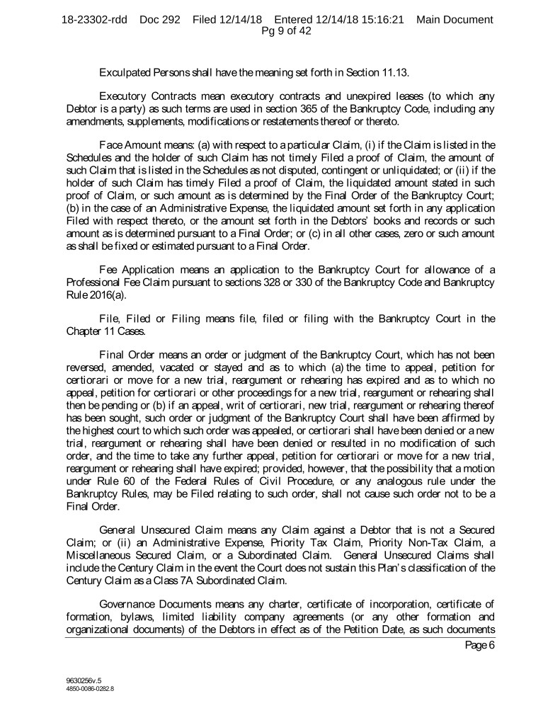 18-23302-rdd Doc 292 Filed 12/14/18 Entered 12/14/18 15:16:21 Main Document Pg 9 of 42 Exculpated Persons shall have the meaning set forth in Section 11.13. Executory Contracts mean executory contracts and unexpired leases (to which any Debtor is a party) as such terms are used in section 365 of the Bankruptcy Code, including any amendments, supplements, modifications or restatements thereof or thereto. Face Amount means: (a) with respect to a particular Claim, (i) if the Claim is listed in the Schedules and the holder of such Claim has not timely Filed a proof of Claim, the amount of such Claim that is listed in the Schedules as not disputed, contingent or unliquidated; or (ii) if the holder of such Claim has timely Filed a proof of Claim, the liquidated amount stated in such proof of Claim, or such amount as is determined by the Final Order of the Bankruptcy Court; (b) in the case of an Administrative Expense, the liquidated amount set forth in any application Filed with respect thereto, or the amount set forth in the Debtors’ books and records or such amount as is determined pursuant to a Final Order; or (c) in all other cases, zero or such amount as shall be fixed or estimated pursuant to a Final Order. Fee Application means an application to the Bankruptcy Court for allowance of a Professional Fee Claim pursuant to sections 328 or 330 of the Bankruptcy Code and Bankruptcy Rule 2016(a). File, Filed or Filing means file, filed or filing with the Bankruptcy Court in the Chapter 11 Cases. Final Order means an order or judgment of the Bankruptcy Court, which has not been reversed, amended, vacated or stayed and as to which (a) the time to appeal, petition for certiorari or move for a new trial, reargument or rehearing has expired and as to which no appeal, petition for certiorari or other proceedings for a new trial, reargument or rehearing shall then be pending or (b) if an appeal, writ of certiorari, new trial, reargument or rehearing thereof has been sought, such order or judgment of the Bankruptcy Court shall have been affirmed by the highest court to which such order was appealed, or certiorari shall have been denied or a new trial, reargument or rehearing shall have been denied or resulted in no modification of such order, and the time to take any further appeal, petition for certiorari or move for a new trial, reargument or rehearing shall have expired; provided, however, that the possibility that a motion under Rule 60 of the Federal Rules of Civil Procedure, or any analogous rule under the Bankruptcy Rules, may be Filed relating to such order, shall not cause such order not to be a Final Order. General Unsecured Claim means any Claim against a Debtor that is not a Secured Claim; or (ii) an Administrative Expense, Priority Tax Claim, Priority Non-Tax Claim, a Miscellaneous Secured Claim, or a Subordinated Claim. General Unsecured Claims shall include the Century Claim in the event the Court does not sustain this Plan’s classification of the Century Claim as a Class 7A Subordinated Claim. Governance Documents means any charter, certificate of incorporation, certificate of formation, bylaws, limited liability company agreements (or any other formation and organizational documents) of the Debtors in effect as of the Petition Date, as such documents Page 6 9630256v.5 4850-0086-0282.8