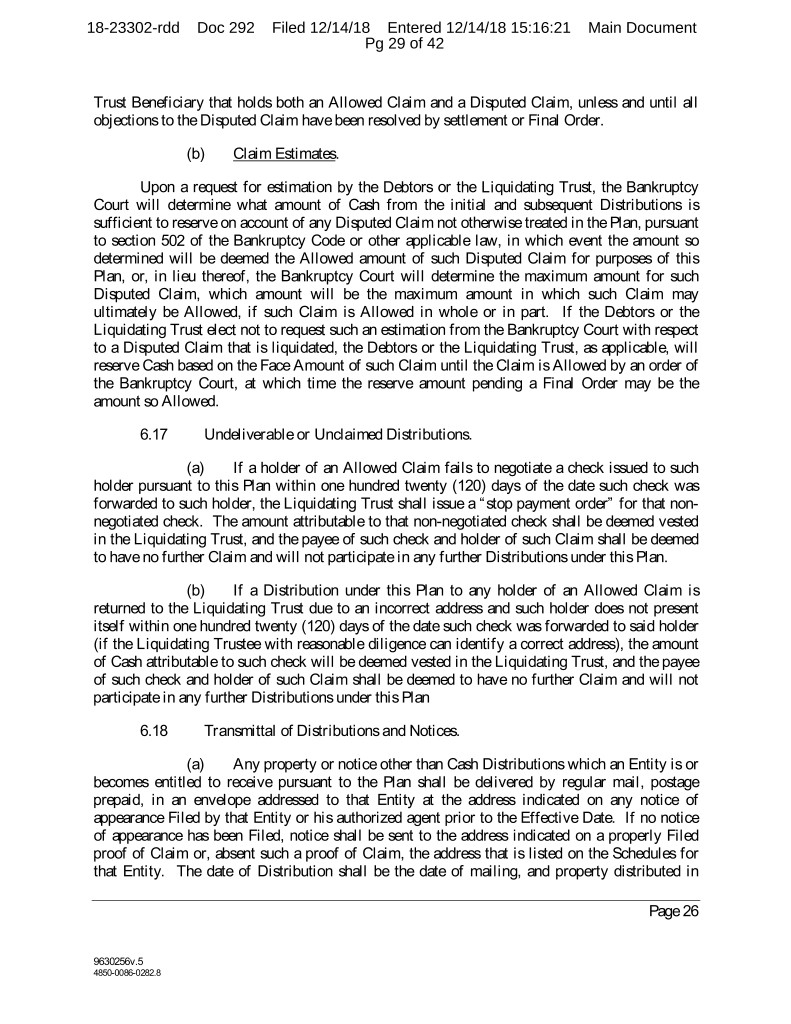18-23302-rdd Doc 292 Filed 12/14/18 Entered 12/14/18 15:16:21 Main Document Pg 29 of 42 Trust Beneficiary that holds both an Allowed Claim and a Disputed Claim, unless and until all objections to the Disputed Claim have been resolved by settlement or Final Order. (b) Claim Estimates. Upon a request for estimation by the Debtors or the Liquidating Trust, the Bankruptcy Court will determine what amount of Cash from the initial and subsequent Distributions is sufficient to reserve on account of any Disputed Claim not otherwise treated in the Plan, pursuant to section 502 of the Bankruptcy Code or other applicable law, in which event the amount so determined will be deemed the Allowed amount of such Disputed Claim for purposes of this Plan, or, in lieu thereof, the Bankruptcy Court will determine the maximum amount for such Disputed Claim, which amount will be the maximum amount in which such Claim may ultimately be Allowed, if such Claim is Allowed in whole or in part. If the Debtors or the Liquidating Trust elect not to request such an estimation from the Bankruptcy Court with respect to a Disputed Claim that is liquidated, the Debtors or the Liquidating Trust, as applicable, will reserve Cash based on the Face Amount of such Claim until the Claim is Allowed by an order of the Bankruptcy Court, at which time the reserve amount pending a Final Order may be the amount so Allowed. 6.17 Undeliverable or Unclaimed Distributions. (a) If a holder of an Allowed Claim fails to negotiate a check issued to such holder pursuant to this Plan within one hundred twenty (120) days of the date such check was forwarded to such holder, the Liquidating Trust shall issue a “stop payment order” for that non- negotiated check. The amount attributable to that non-negotiated check shall be deemed vested in the Liquidating Trust, and the payee of such check and holder of such Claim shall be deemed to have no further Claim and will not participate in any further Distributions under this Plan. (b) If a Distribution under this Plan to any holder of an Allowed Claim is returned to the Liquidating Trust due to an incorrect address and such holder does not present itself within one hundred twenty (120) days of the date such check was forwarded to said holder (if the Liquidating Trustee with reasonable diligence can identify a correct address), the amount of Cash attributable to such check will be deemed vested in the Liquidating Trust, and the payee of such check and holder of such Claim shall be deemed to have no further Claim and will not participate in any further Distributions under this Plan 6.18 Transmittal of Distributions and Notices. (a) Any property or notice other than Cash Distributions which an Entity is or becomes entitled to receive pursuant to the Plan shall be delivered by regular mail, postage prepaid, in an envelope addressed to that Entity at the address indicated on any notice of appearance Filed by that Entity or his authorized agent prior to the Effective Date. If no notice of appearance has been Filed, notice shall be sent to the address indicated on a properly Filed proof of Claim or, absent such a proof of Claim, the address that is listed on the Schedules for that Entity. The date of Distribution shall be the date of mailing, and property distributed in Page 26 9630256v.5 4850-0086-0282.8