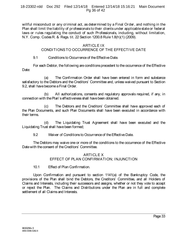 18-23302-rdd Doc 292 Filed 12/14/18 Entered 12/14/18 15:16:21 Main Document Pg 36 of 42 willful misconduct or any criminal act, as determined by a Final Order, and nothing in the Plan shall limit the liability of professionals to their clients under applicable state or federal laws or rules regulating the conduct of such Professionals, including, without limitation, N.Y. Comp. Codes R. & Regs. tit. 22 Section 1200.8 Rule 1.8(h)(1) (2009). ARTICLE IX CONDITIONS TO OCCURRENCE OF THE EFFECTIVE DATE 9.1 Conditions to Occurrence of the Effective Date. For each Debtor, the following are conditions precedent to the occurrence of the Effective Date: (a) The Confirmation Order shall have been entered in form and substance satisfactory to the Debtors and the Creditors’ Committee and, unless waived pursuant to Section 9.2, shall have become a Final Order. (b) All authorizations, consents and regulatory approvals required, if any, in connection with the Plan’s effectiveness shall have been obtained. (c) The Debtors and the Creditors’ Committee shall have approved each of the Plan Documents, and such Plan Documents shall have been executed in accordance with their terms. (d) The Liquidating Trust Agreement shall have been executed and the Liquidating Trust shall have been formed; 9.2 Waiver of Conditions to Occurrence of the Effective Date. The Debtors may waive one or more of the conditions to the occurrence of the Effective Date with the consent of the Creditors’ Committee. ARTICLE X EFFECT OF PLAN CONFIRMATION; INJUNCTION 10.1 Effect of Plan Confirmation. Upon Confirmation and pursuant to section 1141(a) of the Bankruptcy Code, the provisions of the Plan shall bind the Debtors, the Creditors’ Committee, and all Holders of Claims and Interests, including their successors and assigns, whether or not they vote to accept or reject the Plan. The Claims and Distributions under the Plan are in full and complete settlement of all Claims and Interests. Page 33 9630256v.5 4850-0086-0282.8