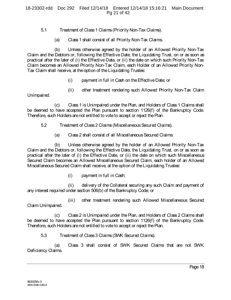 18-23302-rdd Doc 292 Filed 12/14/18 Entered 12/14/18 15:16:21 Main Document Pg 21 of 42 5.1 Treatment of Class 1 Claims (Priority Non-Tax Claims). (a) Class 1 shall consist of all Priority Non-Tax Claims. (b) Unless otherwise agreed by the holder of an Allowed Priority Non-Tax Claim and the Debtors or, following the Effective Date, the Liquidating Trust, on or as soon as practical after the later of (i) the Effective Date, or (ii) the date on which such Priority Non-Tax Claim becomes an Allowed Priority Non-Tax Claim, each Holder of an Allowed Priority Non- Tax Claim shall receive, at the option of the Liquidating Trustee: (i) payment in full in Cash on the Effective Date; or (ii) other treatment rendering such Allowed Priority Non-Tax Claim Unimpaired. (c) Class 1 is Unimpaired under the Plan, and Holders of Class 1 Claims shall be deemed to have accepted the Plan pursuant to section 1126(f) of the Bankruptcy Code. Therefore, such Holders are not entitled to vote to accept or reject the Plan. 5.2 Treatment of Class 2 Claims (Miscellaneous Secured Claims). (a) Class 2 shall consist of all Miscellaneous Secured Claims. (b) Unless otherwise agreed by the holder of an Allowed Priority Non-Tax Claim and the Debtors or, following the Effective Date, the Liquidating Trust, on or as soon as practical after the later of (i) the Effective Date, or (ii) the date on which such Miscellaneous Secured Claim becomes an Allowed Miscellaneous Secured Claim, each holder of an Allowed Miscellaneous Secured Claim shall receive, at the option of the Liquidating Trustee: (i) payment in full in Cash; (ii) delivery of the Collateral securing any such Claim and payment of any interest required under section 506(b) of the Bankruptcy Code; or (iii) other treatment rendering such Allowed Miscellaneous Secured Claim Unimpaired. (c) Class 2 is Unimpaired under the Plan, and Holders of Class 2 Claims shall be deemed to have accepted the Plan pursuant to section 1126(f) of the Bankruptcy Code. Therefore, such Holders are not entitled to vote to accept or reject the Plan. 5.3 Treatment of Class 3 Claims (SWK Secured Claims). (a) Class 3 shall consist of SWK Secured Claims that are not SWK Deficiency Claims. Page 18 9630256v.5 4850-0086-0282.8