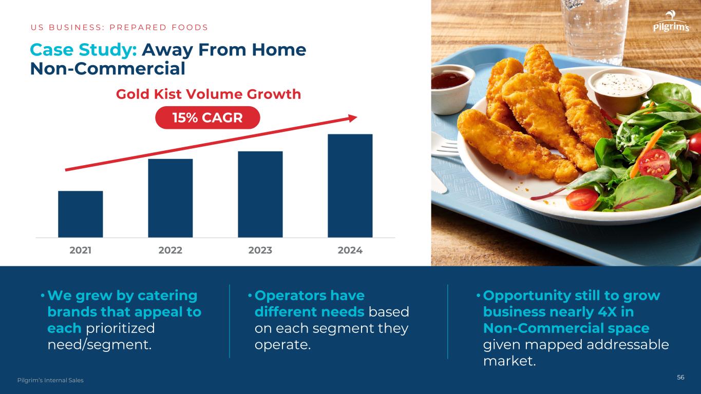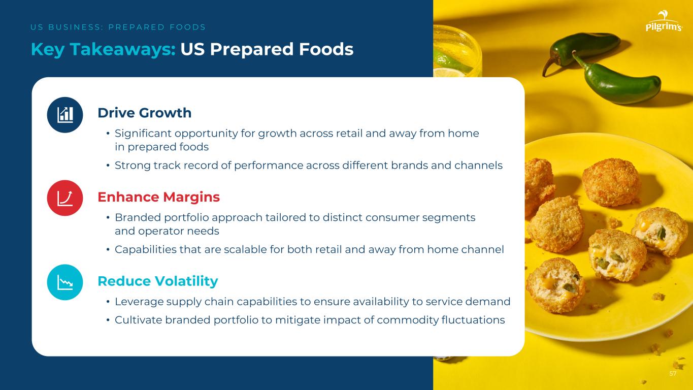 2021202220232024案例研究:Away from Home Non-Commercial US B US I N E S S:P R E P A R E D F O O D S 56Pilgrim的内部销售Gold Kist销量增长15% CAGR •运营商根据其经营的每个细分市场有不同的需求。•我们的增长来自迎合每个优先需求/细分市场的餐饮品牌。•鉴于映射的可寻址市场,仍有机会在非商业空间将业务增长近4倍。
