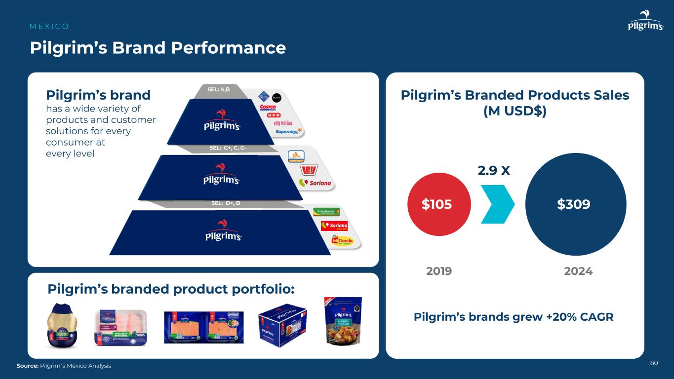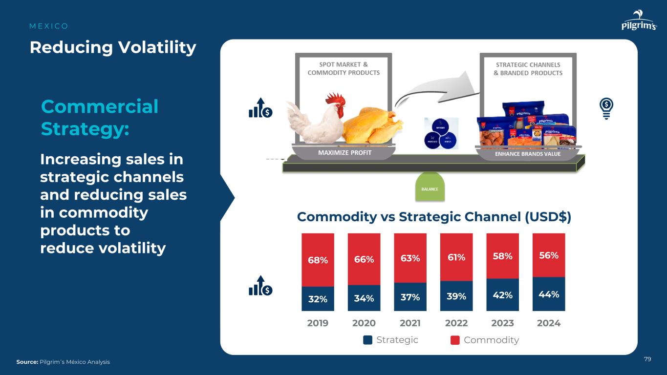 25% 29% 32% 34% 37% 39% 42% 44% 75% 71% 68% 66% 63% 61% 58% 56% 201720182019202020212021202220232024商品vs战略渠道(美元)CommodityStrategic 79降低波动性M E X I C O资料来源:Pilgrim's M é xico Analysis商业战略:增加战略渠道的销售并减少商品产品的销售以降低波动性