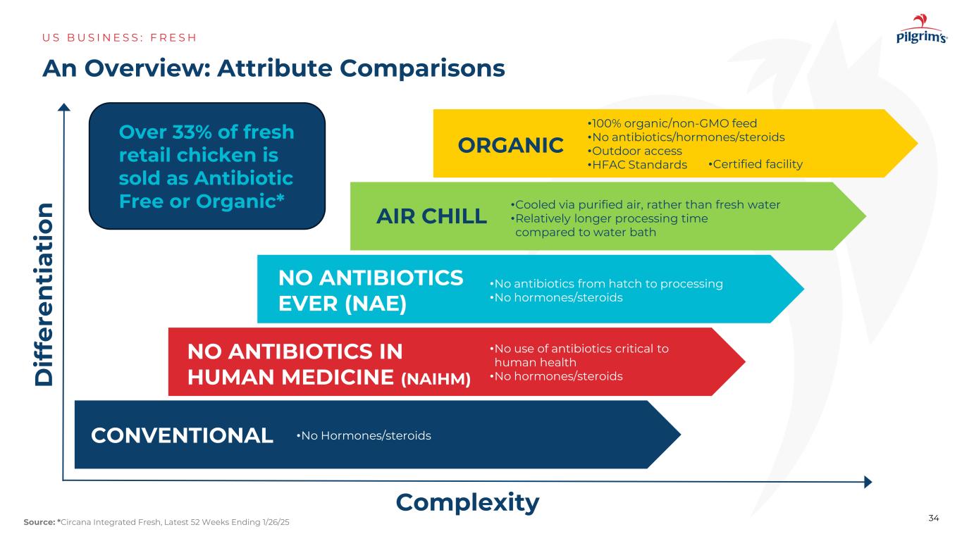 复杂度d if fe re n ti at io n an概述:属性比较US B US I N E S S:F R E S H 34来源:*Circana集成新鲜,最新52周截止1/26/25人类医学(NAIHM)中没有抗生素•没有使用对人体健康至关重要的抗生素•没有常规激素/类固醇•没有激素/类固醇从来没有抗生素(NAE)•从孵化到加工过程中没有抗生素•没有激素/类固醇有机• 100%有机/非转基因饲料•没有抗生素/激素/类固醇•户外准入• HFAC标准•认证设施空气冷却•通过净化空气冷却,而不是淡水•相比水浴加工时间相对更长超33%的生鲜零售鸡肉以无抗生素或有机形式出售*