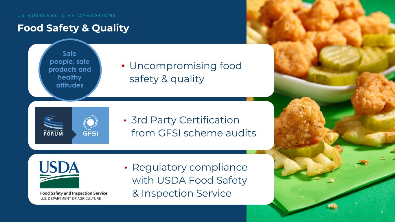 44 Food Safety & Quality US B US I N E S S:L I V E O P E R A T I O N S •毫不妥协的食品安全和质量•来自GFSI计划审计的第三方认证•符合美国农业部食品安全与检验服务的监管规定,确保人们、安全产品和健康态度