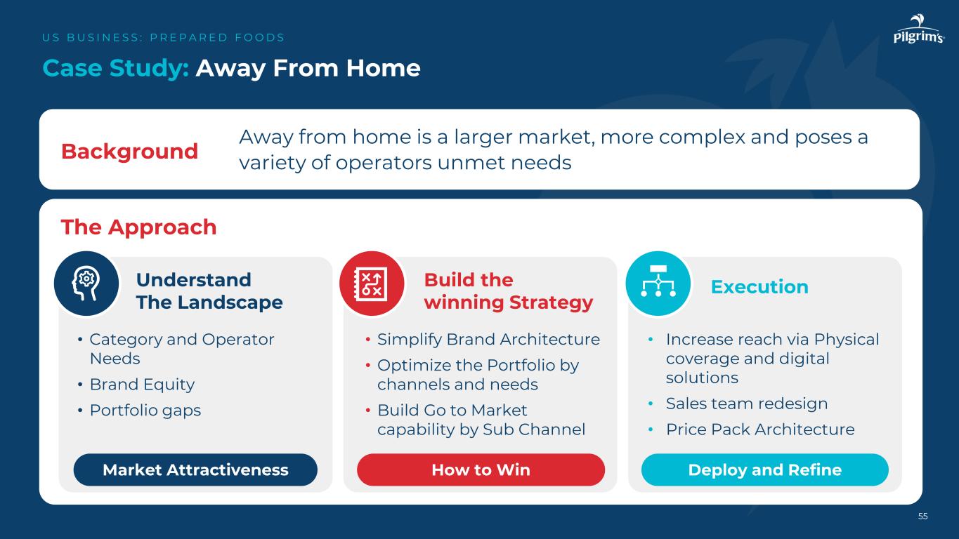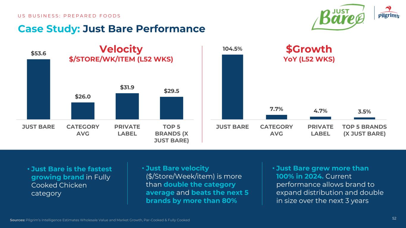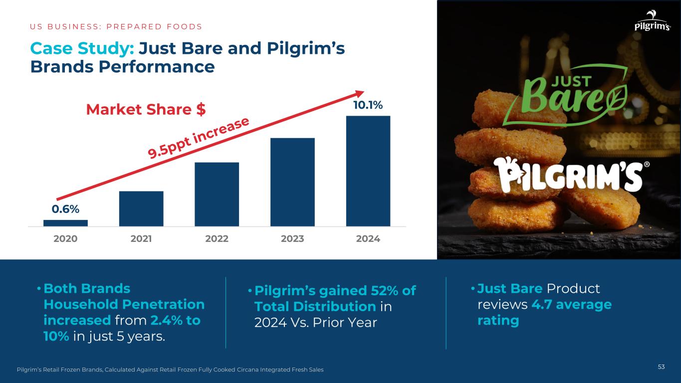案例分析:Just Bare Performance US B US I N E S S:P R E P A R E D F O O D S 52来源:Pilgrim’s Intelligence估计批发价值和市场增长,Par-Cooked & Fully Cooked $ 53.6 $ 26.0 $ 31.9 $ 29.5 Just bare category AVG private label top 5 brands(x just bare)104.5% 7.7% 4.7% 3.5% Just bare category AVG private label top 5 brands(x just bare)• Just bare velocity($/store/week/item)比类别平均水平高出一倍以上,并以超过80%的优势击败后5个品牌• Just bare在2024年增长超过100%。当前业绩允许品牌扩大分销并在未来3年内规模翻倍• Just Bare是全熟鸡品类中增长最快的品牌Velocity $/Store/WK/item(L52WKS)$ growth YoY(L52WKS)