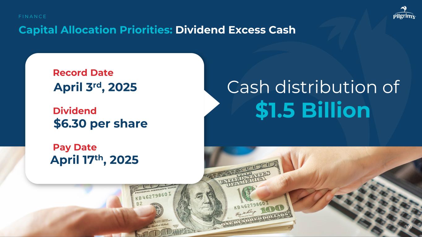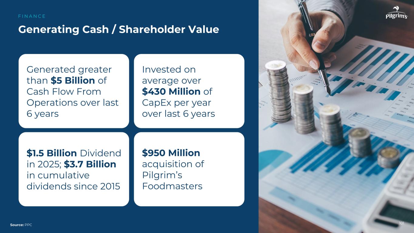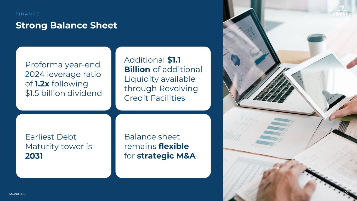 101产生现金/股东价值F I N A N C E来源:PPC在过去6年中从运营中产生了超过50亿美元的现金流在过去6年中平均每年投资超过4.3亿美元的资本支出9.5亿美元收购Pilgrim's Foodmasters在2025年获得15亿美元的股息;自2015年以来累计获得37亿美元的股息