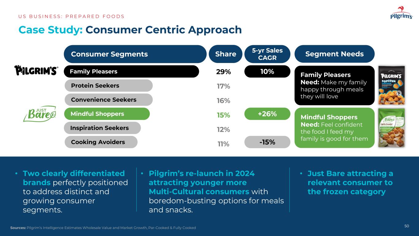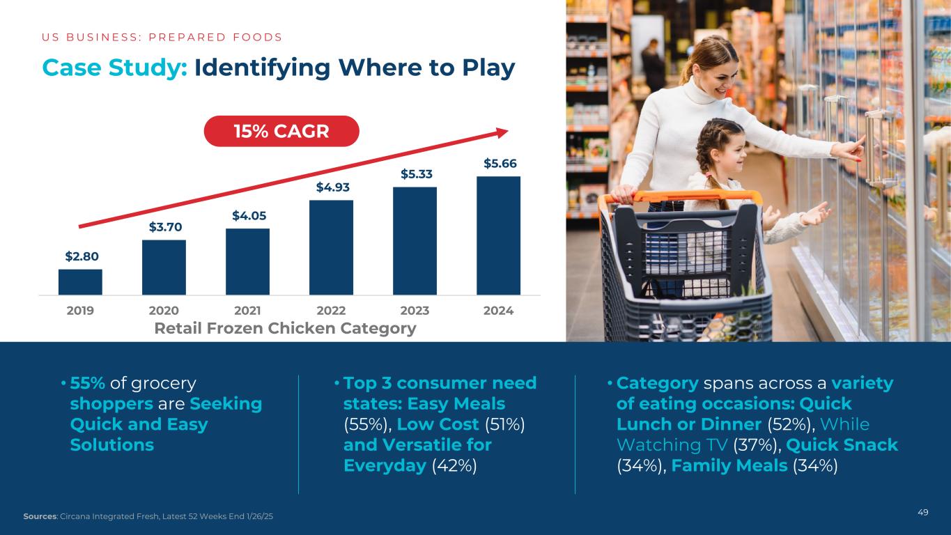 案例研究:确定在哪里可以玩US B US I N E S S:P R E P A R E D F O O D S 49 $ 2.80 $ 3.70 $ 4.05 $ 4.93 $ 5.33 $ 5.66 201920202021202220222023202415% CAGR零售冷冻鸡肉类目•前三大消费者需求状态:轻松用餐(55%)、低成本(51%)和日常多功能(42%)•类别跨越各种用餐场合:快速午餐或晚餐(52%)、一边看电视(37%)、快速零食(34%),家庭聚餐(34%)• 55%的杂货店购物者正在寻求快速简便的解决方案来源:Circana Integrated Fresh,最新52周结束1/26/25