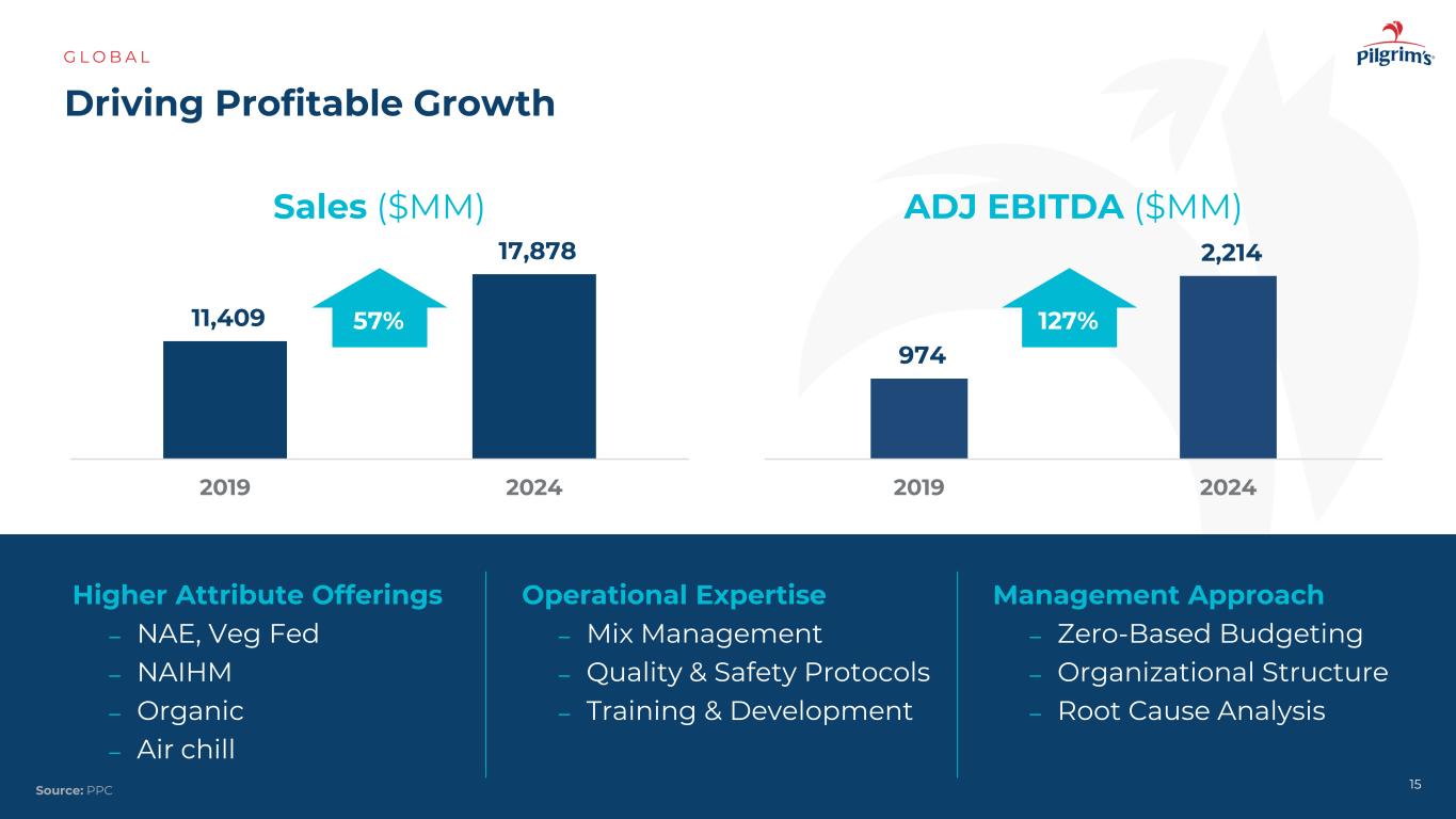 $ 300 $ 250 $ 125 $ 200 $ 180 $ 24 $ 140 $ 100 $ 60 $ 53($ 80)($ 129)$ 93 $ 2102011201220132014201520162017201820192020202120222022202320242016受投资组合组合变化影响2021和2022年受新冠肺炎、通货膨胀、从工厂车间到高级领导层的每一级别的人员短缺承诺每年由零基预算流程驱动到ta l c o g s an d s g & a s av in g s由通过卓越运营提高生产效率驱动G l o b a l运营改进($ mm)14来源:PPC