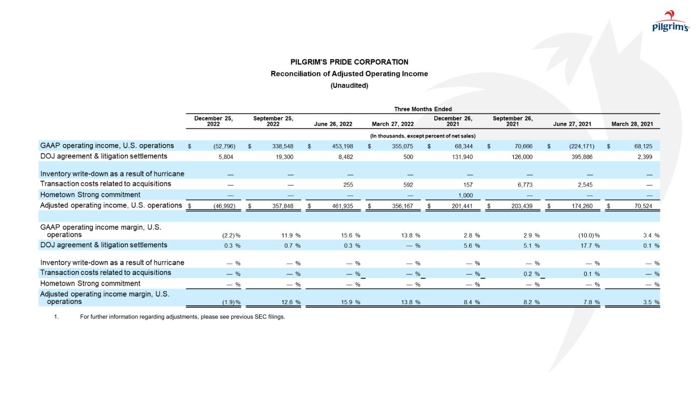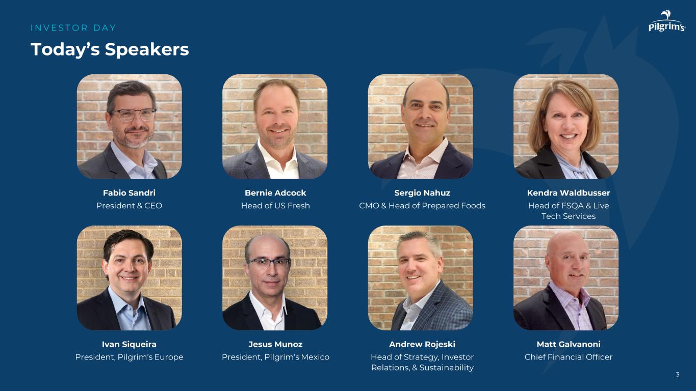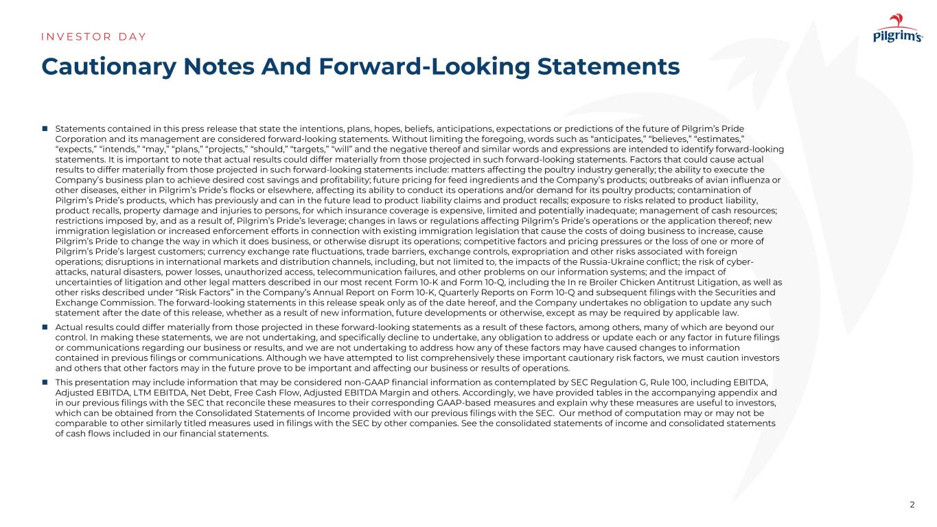 本新闻稿中包含的陈述Pilgrim’s Pride Corporation及其管理层未来的意图、计划、希望、信念、预期、期望或预测的陈述被视为前瞻性陈述。在不限制前述内容的情况下,“预期”、“相信”、“估计”、“预期”、“打算”、“可能”、“计划”、“项目”、“应该”、“目标”、“将”及其否定以及类似的词语和表达旨在识别前瞻性陈述。重要的是要注意,实际结果可能与此类前瞻性陈述中预测的结果大不相同。可能导致实际结果与这些前瞻性陈述中预测的结果大不相同的因素包括:总体上影响家禽行业的事项;执行公司业务计划以实现预期的成本节约和盈利能力的能力;饲料原料和公司产品的未来定价;在Pilgrim’s Pride的鸡群或其他地方爆发禽流感或其他疾病,影响其开展业务的能力和/或对其家禽产品的需求;Pilgrim’s Pride的产品受到污染,此前和未来可能导致产品责任索赔和产品召回;面临与产品责任、产品召回、财产损失和人员受伤相关的风险,保险范围昂贵、有限且可能不充分;现金资源管理;由Pilgrim’s Pride的杠杆施加的限制以及由此导致的限制;影响Pilgrim’s Pride运营或其应用的法律或法规的变化;新的移民立法或与现有移民立法相关的加强执法力度导致经商成本增加,导致Pilgrim’s Pride改变其开展业务的方式,或以其他方式扰乱其运营;竞争因素和定价压力或失去一个或多个Pilgrim’s Pride最大的客户;货币汇率波动、贸易壁垒、外汇管制、征用和其他与国外业务相关的风险;国际市场和分销渠道的中断,包括但不限于俄乌冲突的影响;网络攻击、自然灾害、电力损失、未经授权的访问、电信故障的风险,和我们信息系统上的其他问题;以及我们最近的10-K表格和10-Q表格中描述的诉讼和其他法律事项的不确定性的影响,包括In re肉鸡反垄断诉讼,以及公司的10-K表格年度报告、10-Q表格季度报告和随后向美国证券交易委员会提交的文件中“风险因素”下描述的其他风险。本新闻稿中的前瞻性陈述仅在本新闻稿发布之日发表,公司不承担在本新闻稿发布之日之后更新任何此类陈述的义务,无论是由于新信息、未来发展或其他原因,除非适用法律可能要求。由于这些因素,除其他外,实际结果可能与这些前瞻性陈述中预测的结果存在重大差异,其中许多因素超出了我们的控制范围。在做出这些声明时,我们不承担,特别是拒绝承担任何义务,以解决或更新未来提交的文件或通信中有关我们的业务或结果的每个或任何因素,我们也不承诺解决这些因素中的任何一个可能如何导致先前提交的文件或通信中包含的信息发生变化。尽管我们试图全面列出这些重要的警示性风险因素,但我们必须提醒投资者和其他人,其他因素可能在未来被证明是重要的,并影响我们的业务或经营业绩。该演示文稿可能包含SEC条例G、规则100所设想的可能被视为非GAAP财务信息的信息,包括EBITDA、调整后EBITDA、LTM EBITDA、净债务、自由现金流、调整后EBITDA利润率和其他。因此,我们在随附的附录和我们之前向SEC提交的文件中提供了表格,这些表格将这些措施与其相应的基于GAAP的措施进行了核对,并解释了为什么这些措施对投资者有用,这些措施可以从我们之前向SEC提交的文件中提供的合并损益表中获得。我们的计算方法可能会也可能不会与其他公司在向SEC提交的文件中使用的其他类似名称的措施相比较。请参阅我们财务报表中包含的合并损益表和合并现金流量表。注意事项和前瞻性陈述I N V E S T O R D A Y2