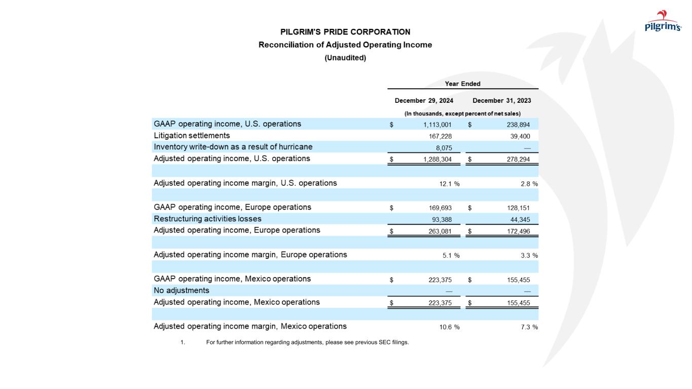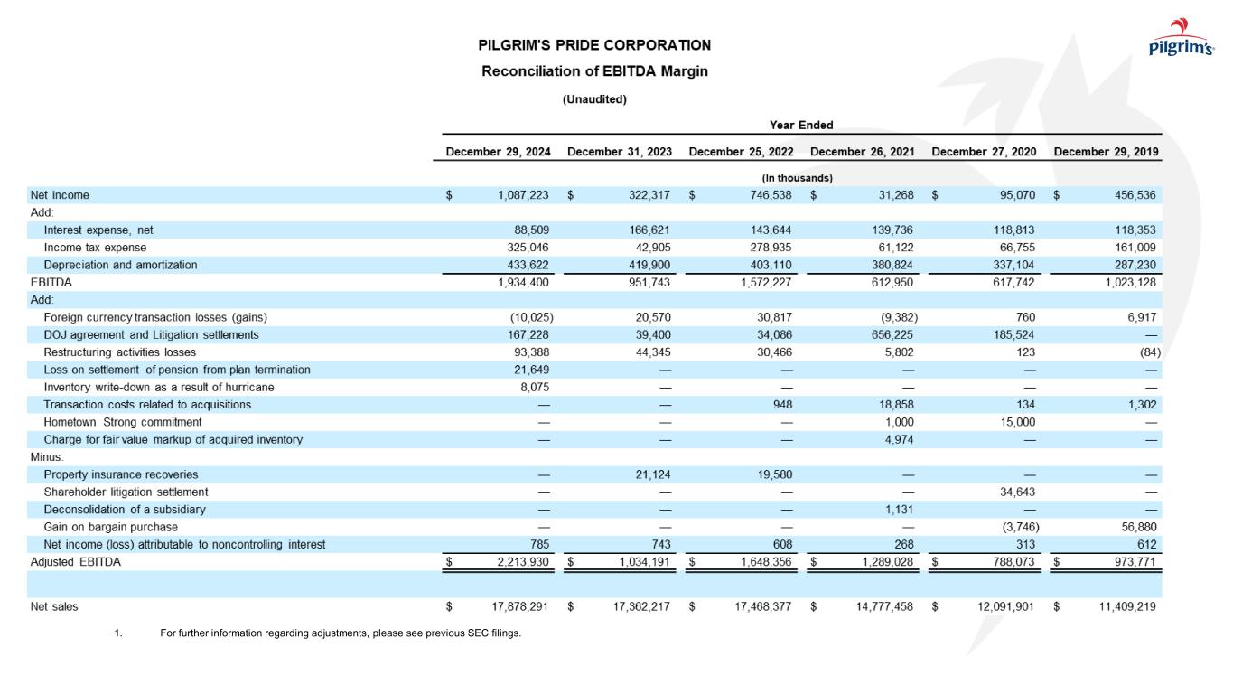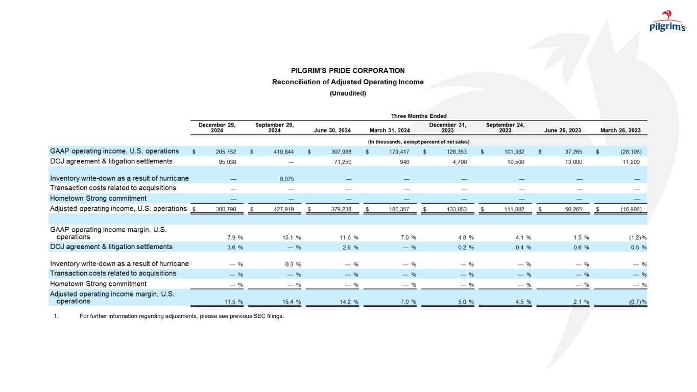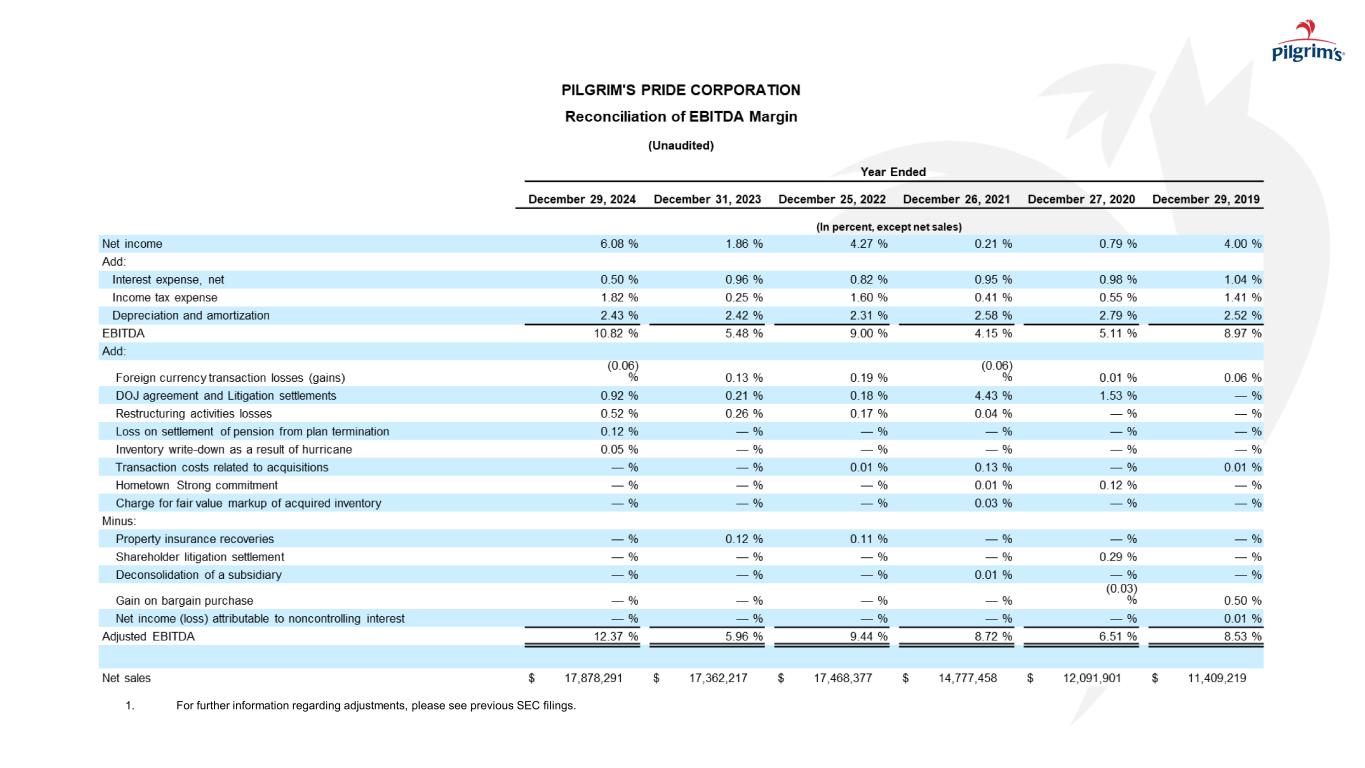 本新闻稿中包含的陈述Pilgrim’s Pride Corporation及其管理层未来的意图、计划、希望、信念、预期、期望或预测的陈述被视为前瞻性陈述。在不限制前述内容的情况下,“预期”、“相信”、“估计”、“预期”、“打算”、“可能”、“计划”、“项目”、“应该”、“目标”、“将”及其否定以及类似的词语和表达旨在识别前瞻性陈述。重要的是要注意,实际结果可能与此类前瞻性陈述中预测的结果大不相同。可能导致实际结果与这些前瞻性陈述中预测的结果大不相同的因素包括:总体上影响家禽行业的事项;执行公司业务计划以实现预期的成本节约和盈利能力的能力;饲料原料和公司产品的未来定价;在Pilgrim’s Pride的鸡群或其他地方爆发禽流感或其他疾病,影响其开展业务的能力和/或对其家禽产品的需求;Pilgrim’s Pride的产品受到污染,此前和未来可能导致产品责任索赔和产品召回;面临与产品责任、产品召回、财产损失和人员受伤相关的风险,保险范围昂贵、有限且可能不充分;现金资源管理;由Pilgrim’s Pride的杠杆施加的限制以及由此导致的限制;影响Pilgrim’s Pride运营或其应用的法律或法规的变化;新的移民立法或与现有移民立法相关的加强执法力度导致经商成本增加,导致Pilgrim’s Pride改变其开展业务的方式,或以其他方式扰乱其运营;竞争因素和定价压力或失去一个或多个Pilgrim’s Pride最大的客户;货币汇率波动、贸易壁垒、外汇管制、征用和其他与国外业务相关的风险;国际市场和分销渠道的中断,包括但不限于俄乌冲突的影响;网络攻击、自然灾害、电力损失、未经授权的访问、电信故障的风险,和我们信息系统上的其他问题;以及我们最近的10-K表格和10-Q表格中描述的诉讼和其他法律事项的不确定性的影响,包括In re肉鸡反垄断诉讼,以及公司的10-K表格年度报告、10-Q表格季度报告和随后向美国证券交易委员会提交的文件中“风险因素”下描述的其他风险。本新闻稿中的前瞻性陈述仅在本新闻稿发布之日发表,公司不承担在本新闻稿发布之日之后更新任何此类陈述的义务,无论是由于新信息、未来发展或其他原因,除非适用法律可能要求。由于这些因素,除其他外,实际结果可能与这些前瞻性陈述中预测的结果存在重大差异,其中许多因素超出了我们的控制范围。在做出这些声明时,我们不承担,特别是拒绝承担任何义务,以解决或更新未来提交的文件或通信中有关我们的业务或结果的每个或任何因素,我们也不承诺解决这些因素中的任何一个可能如何导致先前提交的文件或通信中包含的信息发生变化。尽管我们试图全面列出这些重要的警示性风险因素,但我们必须提醒投资者和其他人,其他因素可能在未来被证明是重要的,并影响我们的业务或经营业绩。该演示文稿可能包含SEC条例G、规则100所设想的可能被视为非GAAP财务信息的信息,包括EBITDA、调整后EBITDA、LTM EBITDA、净债务、自由现金流、调整后EBITDA利润率和其他。因此,我们在随附的附录和我们之前向SEC提交的文件中提供了表格,这些表格将这些措施与其相应的基于GAAP的措施进行了核对,并解释了为什么这些措施对投资者有用,这些措施可以从我们之前向SEC提交的文件中提供的合并损益表中获得。我们的计算方法可能会也可能不会与其他公司在向SEC提交的文件中使用的其他类似名称的措施相比较。请参阅我们财务报表中包含的合并损益表和合并现金流量表。注意事项和前瞻性陈述I N V E S T O R D A Y2