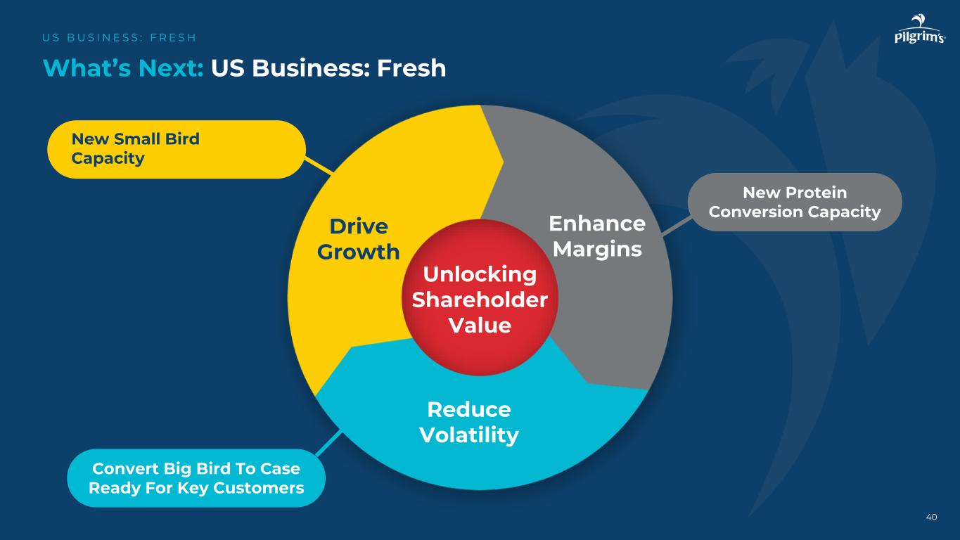 新的蛋白质转化能力40下一步是什么:美国业务:新鲜的美国B美国N E S:F R E S H解锁股东价值驱动增长提升利润率降低波动新的小鸟产能转化大鸟为关键客户准备好案例