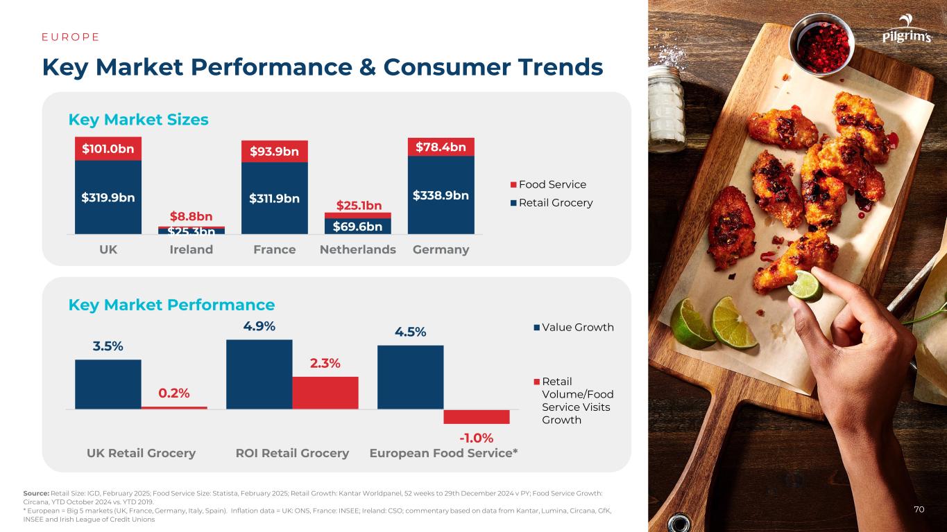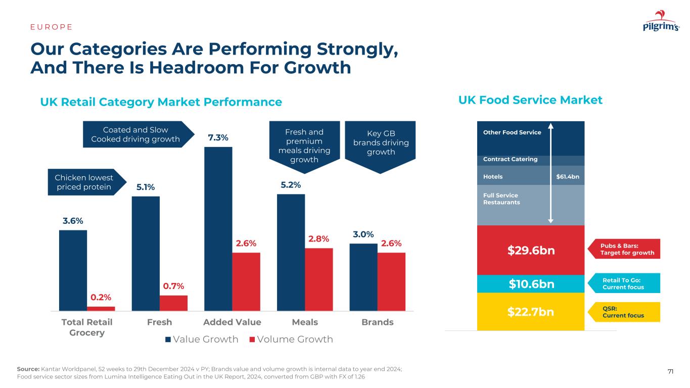 3.5% 4.9% 4.5% 0.2% 2.3%-1.0 %英国零售杂货ROI零售杂货欧洲食品服务*价值增长零售量/餐饮服务访问增长关键市场表现&消费趋势E U R O P资料来源:零售规模:IGD,2025年2月;餐饮服务规模:Statista,2025年2月;零售增长:凯度消费者指数,截至2024年12月29日的52周v PY;餐饮服务增长:Circana,YTD 2024年10月vs. YTD 2019。*欧洲= 5大市场(英国、法国、德国、意大利、西班牙)。通胀数据=英国:ONS,法国:INSEE;爱尔兰:CSO;基于Kantar、Lumina、Circana、GFK、INSEE和爱尔兰信用合作社联盟数据的评论3199亿美元253亿美元3119亿美元696亿美元3389亿美元1010亿美元88亿美元939亿美元251亿美元784亿美元英国爱尔兰法国荷兰德国食品服务零售杂货主要市场规模主要市场表现70