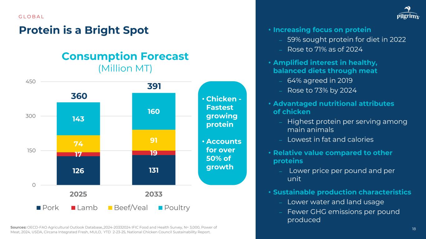 蛋白质是亮点G L O B A L消费预测(百万吨)•日益关注蛋白质– 2022年59%寻求蛋白质用于饮食–截至2024年升至71% •对健康的兴趣扩大,通过肉类实现均衡饮食– 2019年达成协议的比例为64% –到2024年上升至73% •鸡肉的优势营养属性–主要动物中每份蛋白质最高–脂肪和卡路里最低•与其他蛋白质相比的相对价值–每磅和每单位价格更低•可持续生产特性–更低的水和土地使用–更少的每磅生产的GHG排放1812613117197491143160015030045020252033猪羊牛肉/小牛肉家禽•鸡肉-生长最快的蛋白质•占增长的50%以上360391资料来源:经合组织-粮农组织农业展望数据库,2024-20332024 IFIC食品与健康调查,N = 3,000,肉类的力量,2024年,美国农业部,Circana Integrated Fresh,MULO,YTD2-23-25,国家鸡肉委员会可持续发展报告。