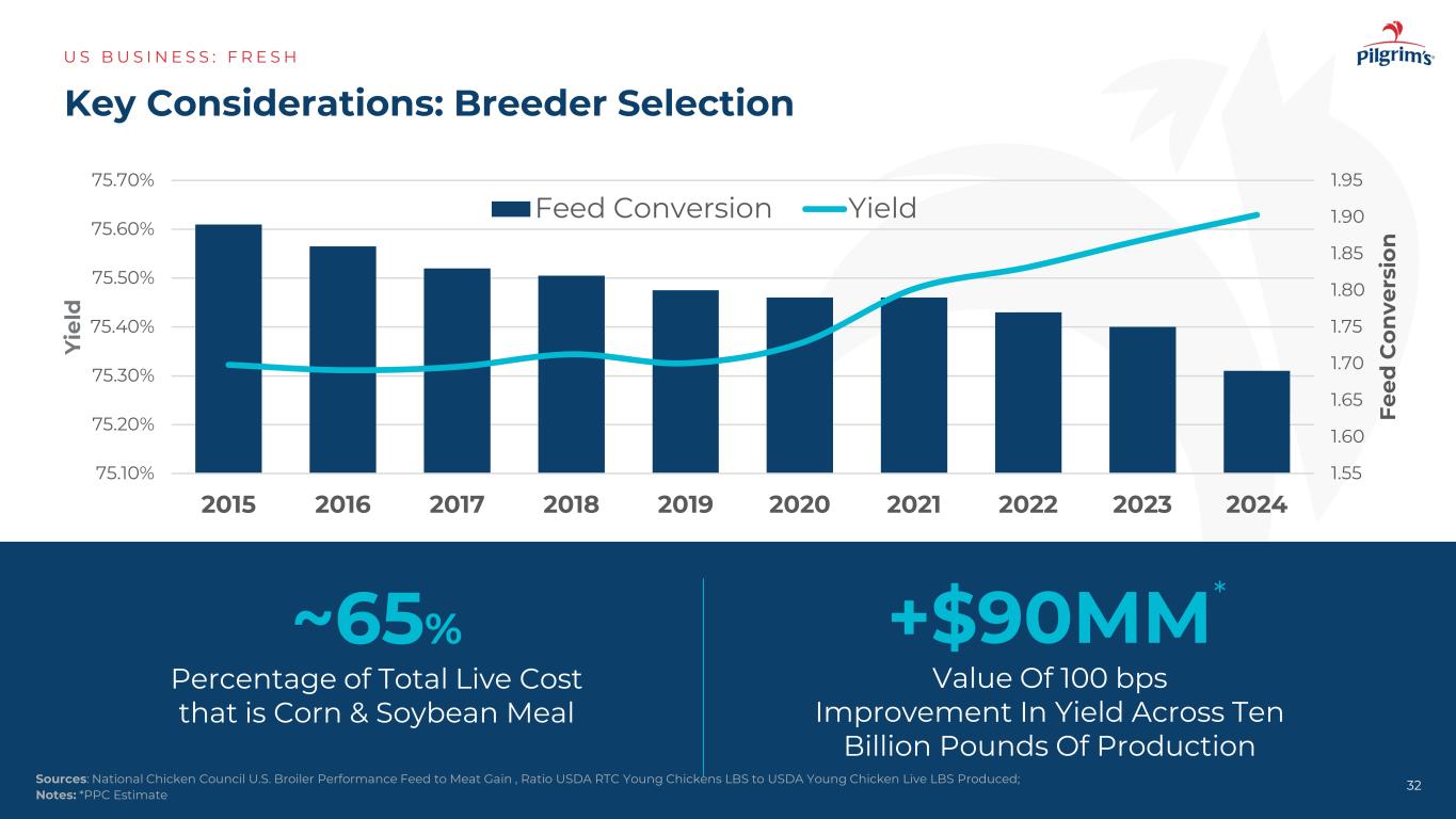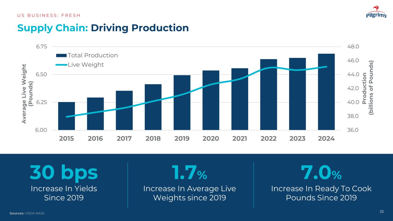 关键考虑因素:种鸡选择美国B美国N E S:F R E S H 32来源:美国国家鸡肉委员会美国肉鸡性能饲料对肉类的增益,USDA RTC幼鸡LBS与USDA幼鸡活LBS生产比;注:*PPC预估~65%百分比的总活成本即玉米&豆粕+ $ 90mm值100bps产量改善跨越百亿磅产量1.55 1.60 1.65 1.70 1.75 1.80 1.85 1.90 1.95 75.10% 75.20% 75.30% 75.40% 75.50% 75.60% 75.70% 20152016201720182019202020212022202220232024 FEed C on ve rs io n yi el d饲料转换产量*