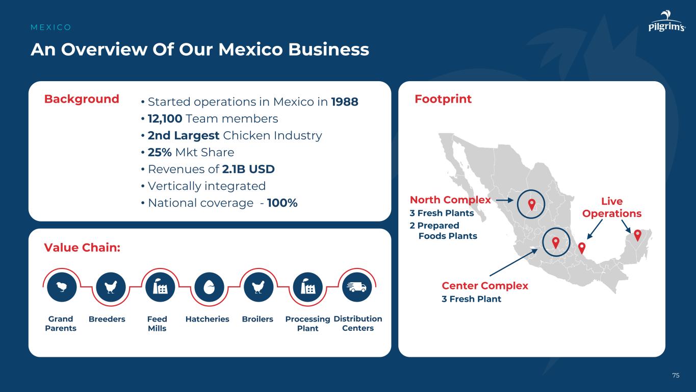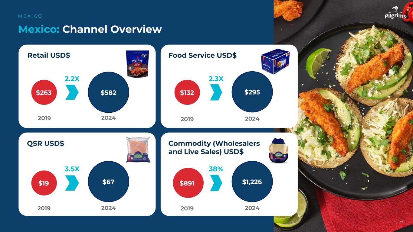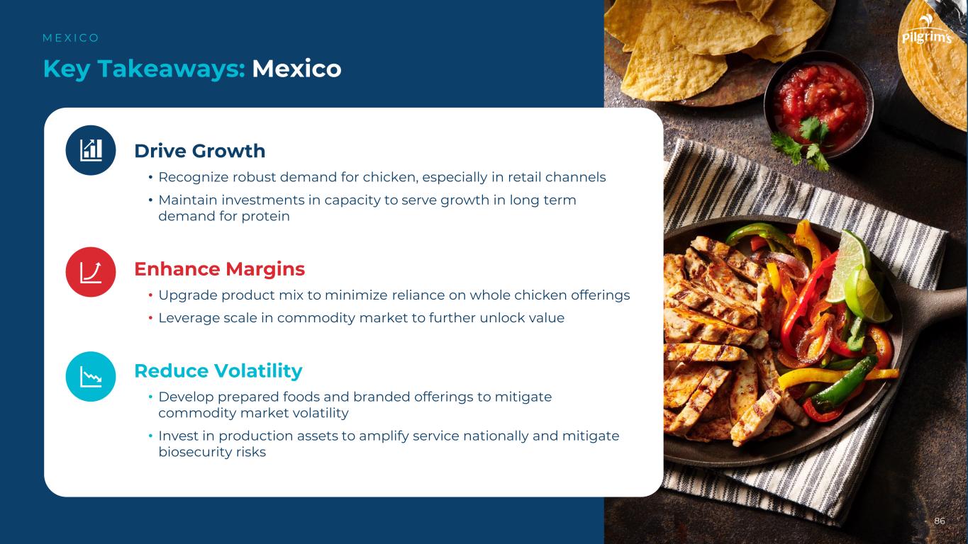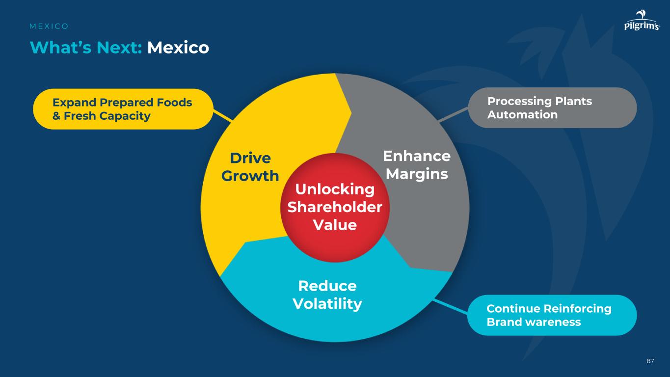 86个关键要点:墨西哥M E X I C O推动增长•认识到对鸡肉的强劲需求,特别是在零售渠道•保持对能力的投资,以服务于蛋白质长期需求的增长,提高利润率•升级产品组合,最大限度地减少对整鸡产品的依赖•利用商品市场的规模,进一步释放价值,降低波动•开发预制食品和品牌产品,以缓解商品市场波动•投资于生产资产,以扩大服务范围并减轻生物安全风险