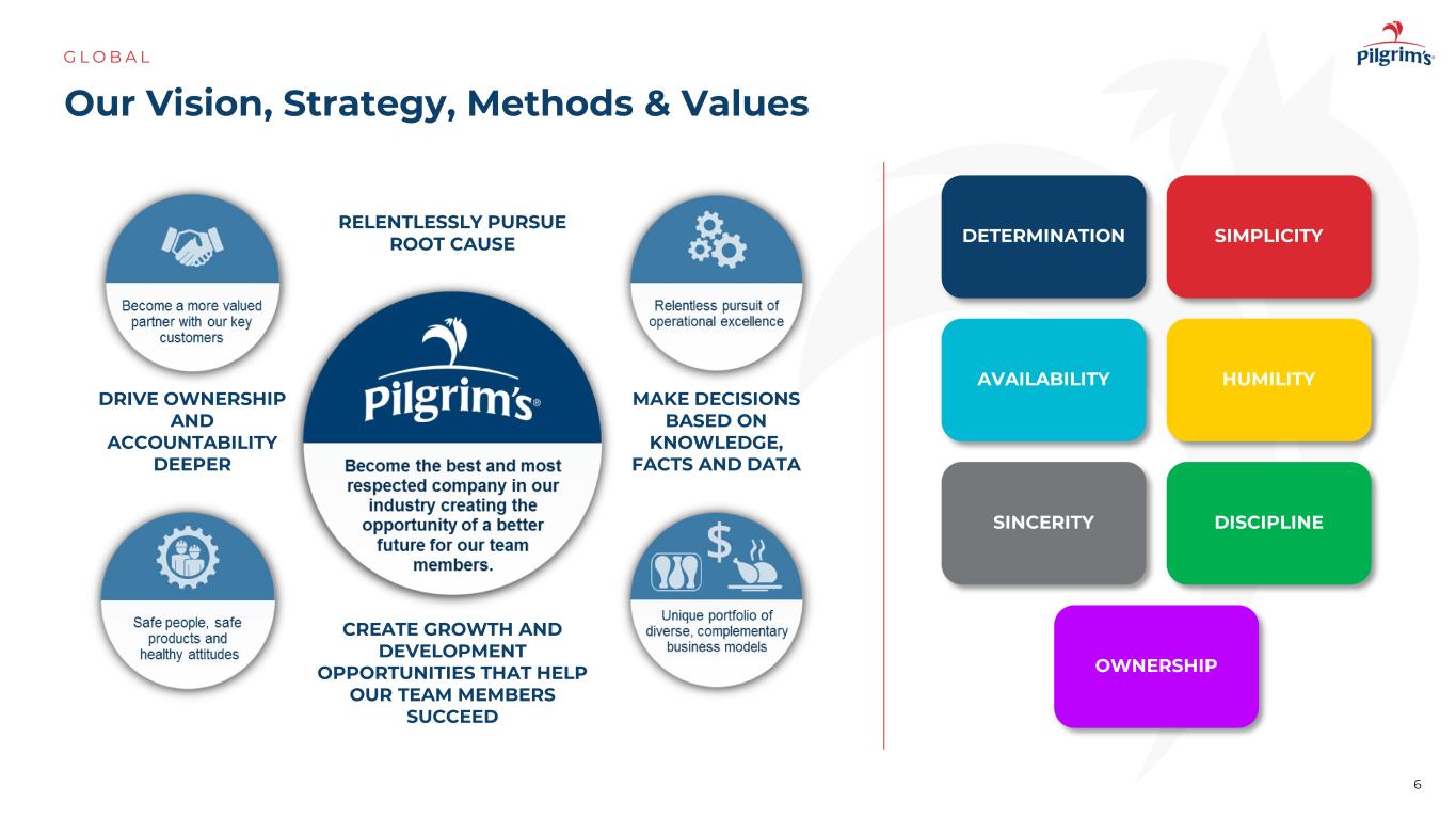 5 A龙头食品公司G L O B A L数据以每只鸡销售的磅数来衡量。1946200720142017CASE ready small bird big bird prepared foods business units founded Pittsburg,tx14 in Mexico lBS of chickens sold out every 14 in the U.K. Nearly lBS of chickens sold out of every 2019 in the U.S. Nearly lBS of chickens sold out of every 1614 in the U.K. Nearly lBS of pigs sold out of every 20092021 fresh processing prepared foods Mexico PILGRIM’s UK MOY Park PILGRIM’s food mm