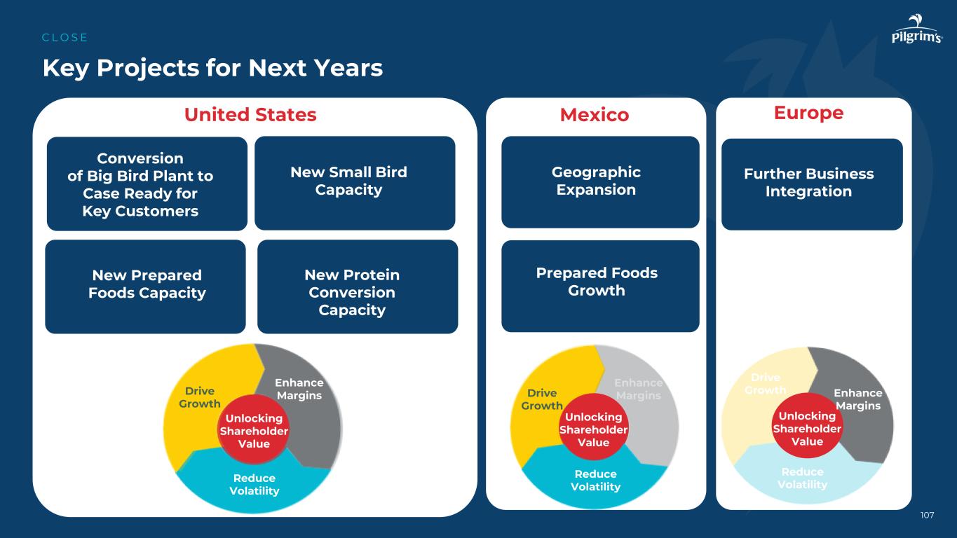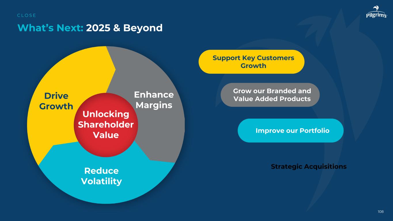 Grow our branded and value-added products 108 What’s next:2025 & beyond C L O S E add small bird capacity unlocking shareholder value drive growth enhances margin reduction volatility support key customers growth improve our portfolio strategic acquisition