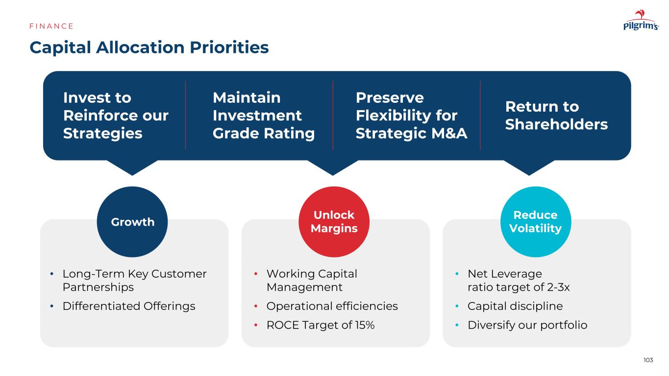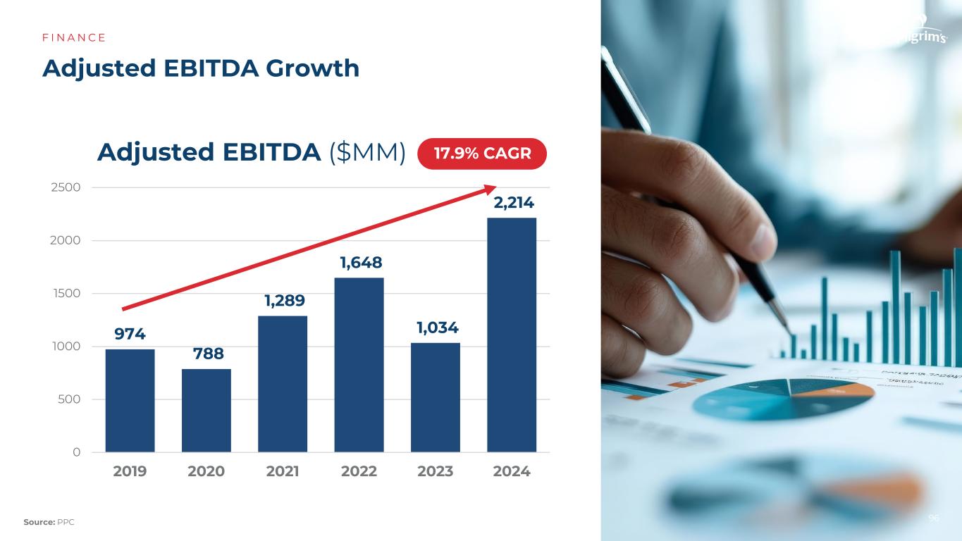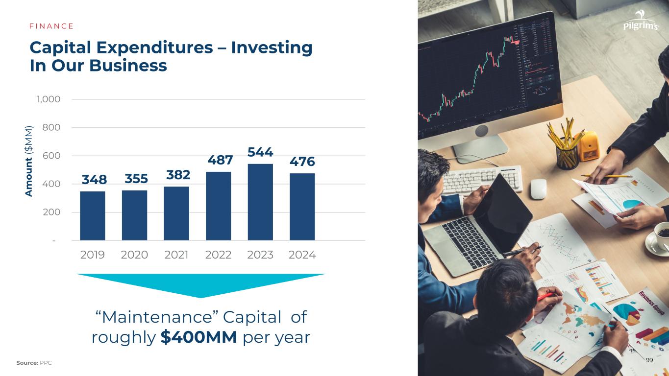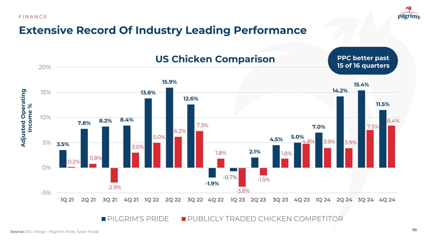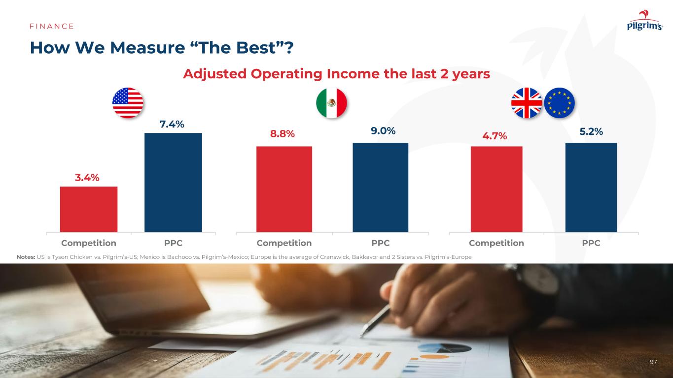 我们如何衡量“最好”?F I N A N C E Notes:US is Tyson Chicken vs. Pilgrim‘s-US;Mexico is Bachoco vs. Pilgrim’s-Mexico;Europe is the average of Cranswick,Bakkavor and 2 Sisters vs. Pilgrim's-Europe competition PPC adjusted operating income the last 2 years competition PPC competition PPC 3.4% 4.7% 7.4% 9.0% 8.8% 5.2% 97