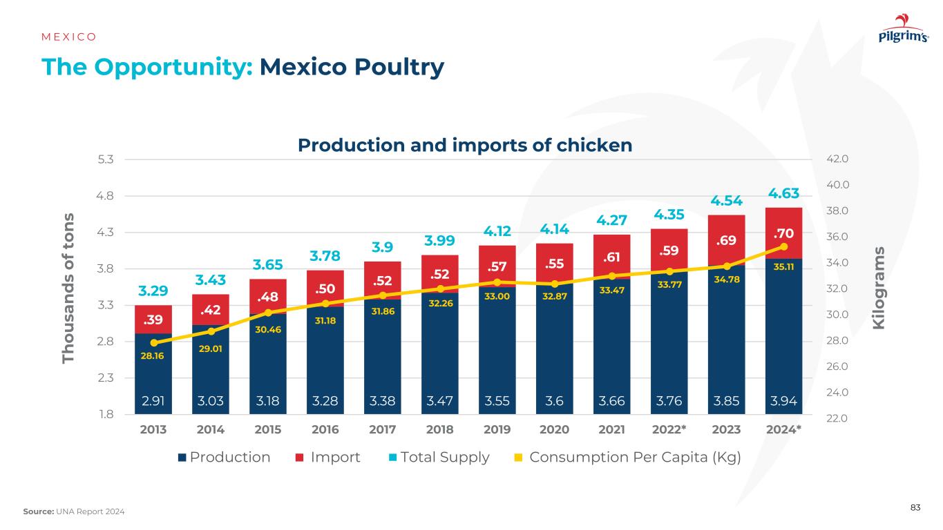 The Opportunity:Mexico poultry M E X I C O来源:UNA Report 2024 Production及进口鸡肉2.91 3.03 3.18 3.28 3.38 3.47 3.55 3.6 3.66 3.76 3.85 3.94 3.39.4 2.48.5 0.5 2.5 2.57.55.6 1.59.69.70 3.29 3.43 3.65 3.78 3.9 3.99 4.12 4.14 4.27 4.35 4.54 4.63 1.8 2.3 2.8 3.3 3.84.34.8 5.3 2013201420152016201720182019202020212022*2023 2024*生产进口人均总供应消费量(kg)Th ou sa n d s of t on s k ilo g ra m s 42.04 0.03 8.03 4.03 0.0 26.02 2.03 6.03 2.028.02 4.02 8.16 29.01 30.46 31.18 31.8632.26 33.00 32.87 33.47 33.77 34.78 35.11 83