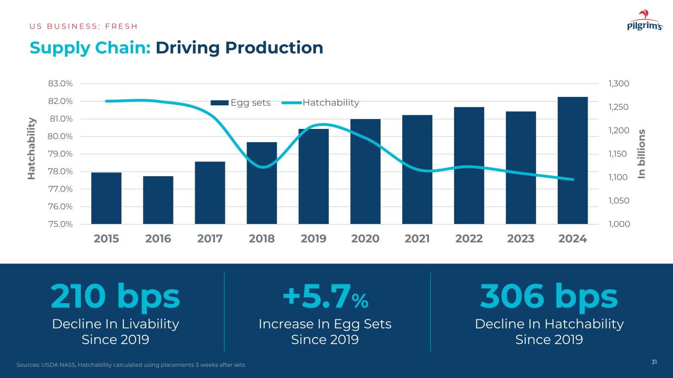 供应链:推动生产US B US I N E S S:F R E S H 31来源:美国农业部NASS,使用套后3周放置数计算的孵化率+ 5.7%自2019年以来鸡蛋套增加306bps自2019年以来孵化率下降1,0001,0501,1001,1501,20121,2501,30075.0% 76.0% 77.0% 78.0% 79.0% 80.0% 81.0% 82.0% 83.0% 2015201620172018201920202021202220232024在b ill io n s H at ch ab ili ty鸡蛋套孵化率210 bps自2019年以来宜居性下降