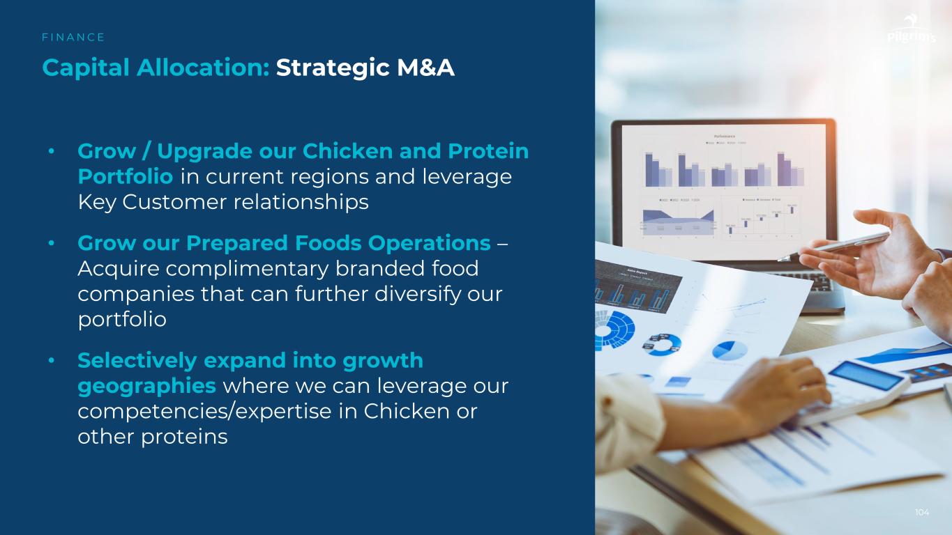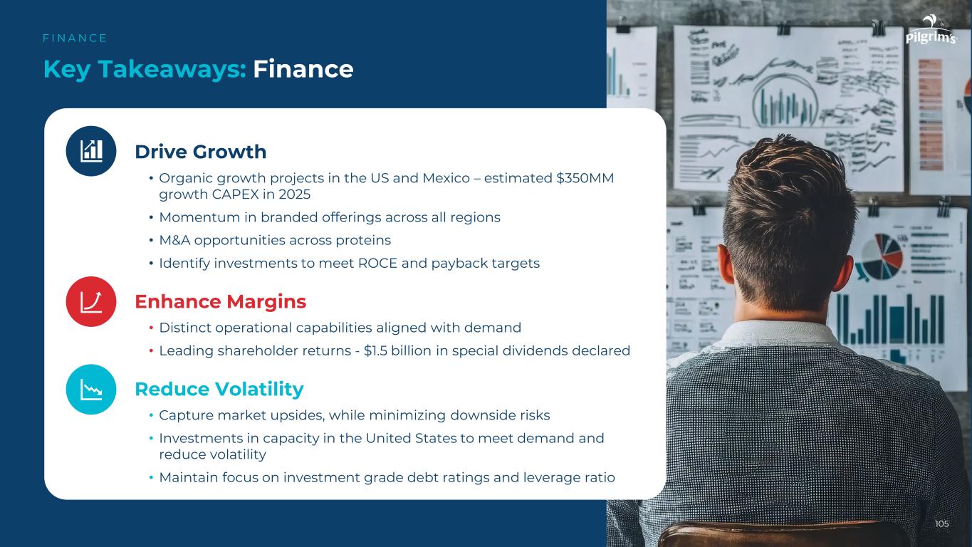 104资本配置:战略并购F I N A N C E •在当前地区发展/升级我们的鸡肉和蛋白质产品组合,并利用关键客户关系•发展我们的预制食品业务–收购免费的品牌食品公司,可以进一步使我们的产品组合多样化•有选择地扩展到增长地区,在那里我们可以利用我们在鸡肉或其他蛋白质方面的能力/专长