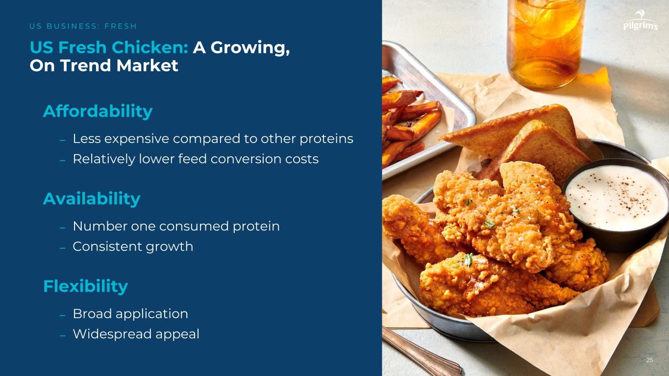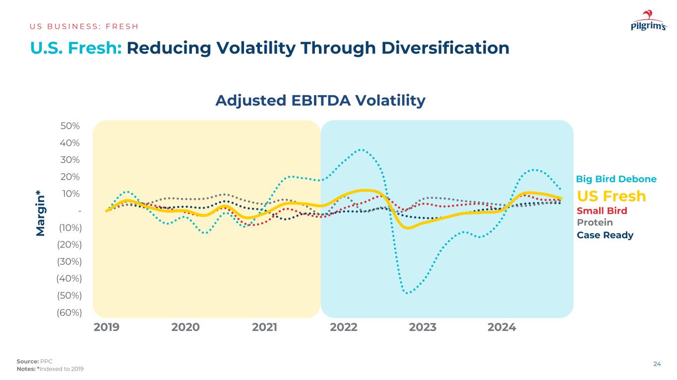 (6,000)(5,000)(4,000)(3,000)(2,000)(1,000)-1,0002,0003,0004,0005,0002019202020212021202220232024 m ar g in*U.S. Fresh:通过多元化降低波动性US B US I N E S:F R E S H24来源:PPC Notes:*指数化至2019年大鸟Debone美国新鲜小鸟蛋白案调整后EBITDA波动率(%)%)(%)%)(%)(%)(%)%%%%