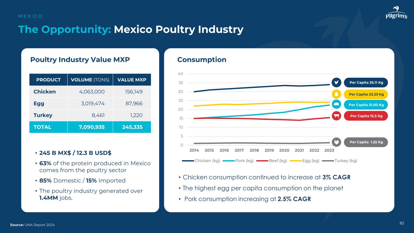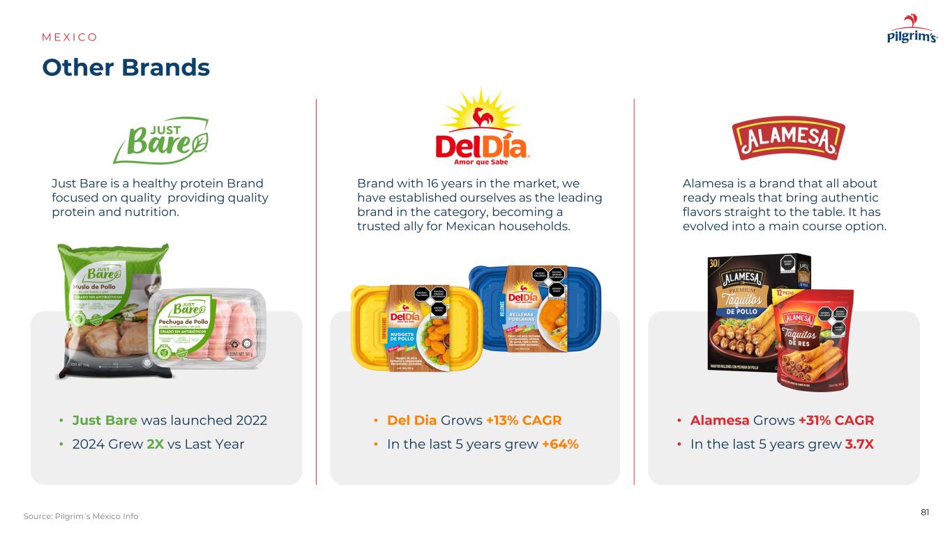 其他品牌ME X I C O 81Source:Pilgrim's M é xico Info品牌凭借16年的市场经验,我们已经确立了自己在品类中的领导品牌,成为墨西哥家庭值得信赖的盟友。Just Bare是一个健康的蛋白质品牌,专注于质量,提供优质的蛋白质和营养。Alamesa是一个关于即食的品牌,它将正宗的味道直接带到餐桌上。它已演变成一种主要的课程选择。• Just Bare于2022年推出• 2024年较去年增长2倍• Del Dia增长+ 13%的复合年增长率•过去5年增长+ 64% • Alamesa增长+ 31%的复合年增长率•过去5年增长3.7倍