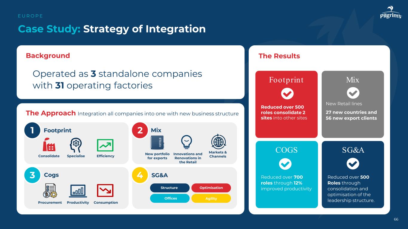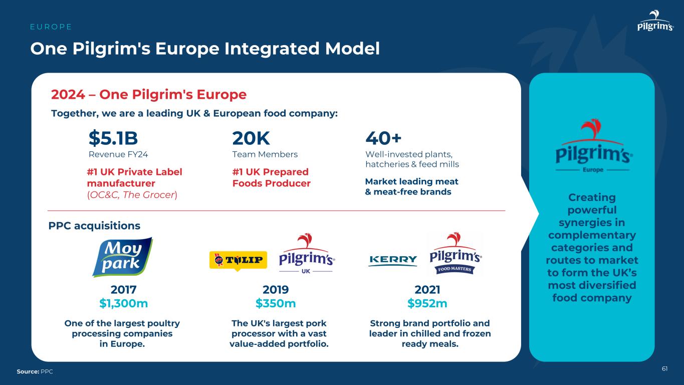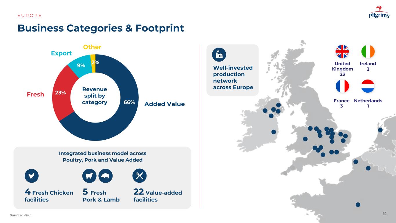61 One Pilgrim's Europe Integrated Model E U R O P E来源:PPC欧洲最大的家禽加工公司之一。英国最大的猪肉加工商,拥有庞大的增值产品组合。强大的品牌组合和冰鲜和冷冻即食食品的领导者。2017年13亿美元2019年3.5亿美元2021年9.52亿美元一起,我们是一家领先的英国和欧洲食品公司:# 1家英国自有品牌制造商(OC & C,The Grocer)# 1家英国预制食品生产商,在互补的品类和上市路线上创造强大的协同效应,形成英国最多元化的食品公司市场领先的无肉和无肉品牌$ 5.1B收入FY24 20K团队成员40 +投资良好的工厂、孵化场和饲料厂PPC收购2024 – One Pilgrim's Europe