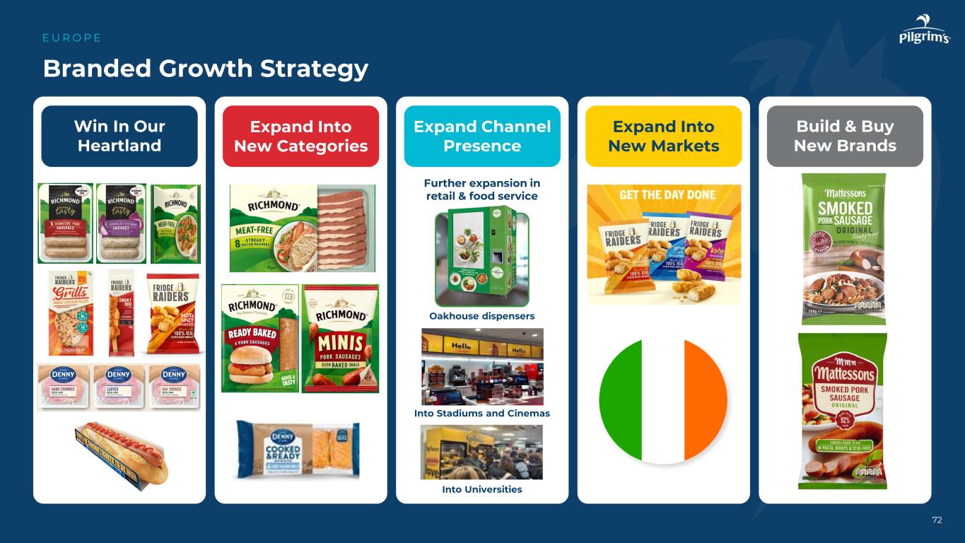 我们的品类表现强劲,存在增长空间E U R O P E来源:凯度消费者指数,截至2024年12月29日的52周v PY;品牌价值和数量增长为截至2024年底的内部数据;食品服务行业规模来自Lumina Intelligence Eating in the UK Report,2024,以英镑换算,汇率为1.26 3.6% 5.1% 7.3% 5.2% 3.0% 0.2% 0.7% 2.6% 2.8% 2.6%零售杂货总额新鲜增值膳食品牌价值增长数量增长227亿美元106亿美元296亿美元鸡肉最低价蛋白包衣和慢煮推动增长全服务餐厅酒店签约餐饮其他食品服务614亿美元英国零售类别市场表现英国食品服务市场新鲜和优质膳食推动增长英国主要品牌推动增长Pubs & Bars:增长目标QSR:当前焦点零售去:当前焦点71