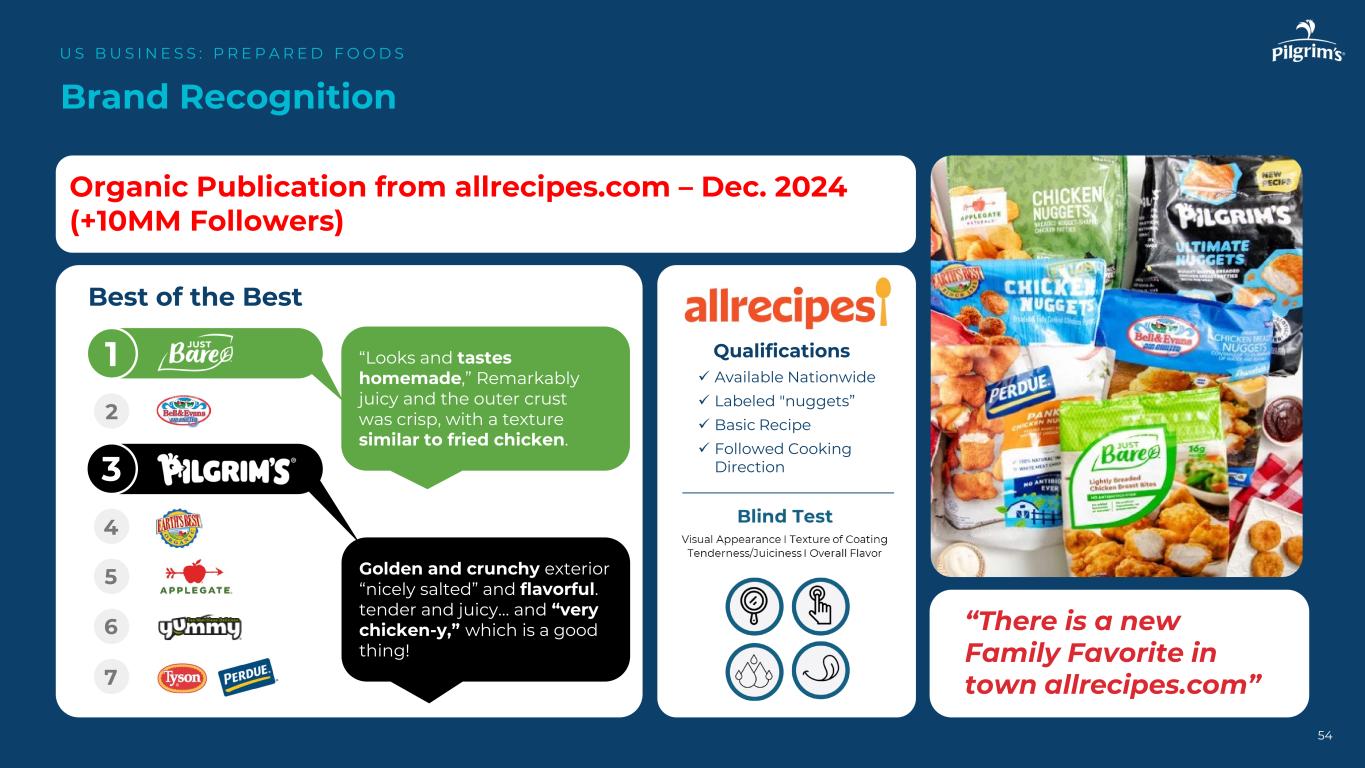 54品牌认知度US B US I N E S S:P R E P A R E D F O O D S Organic Publication from allrecipes.com – December 2024(+ 10mm followers)“Town allrecipes.com有一个新的家庭最爱”best of the best 1234567金黄松脆的外观“很咸”,味道鲜美。又嫩又多汁……还有“很鸡肉-y”,这是件好事!“看起来和味道都是自制的”,显着多汁,外皮酥脆,口感类似炸鸡。资质可查全国标注“金块”基本食谱遵循烹饪方向