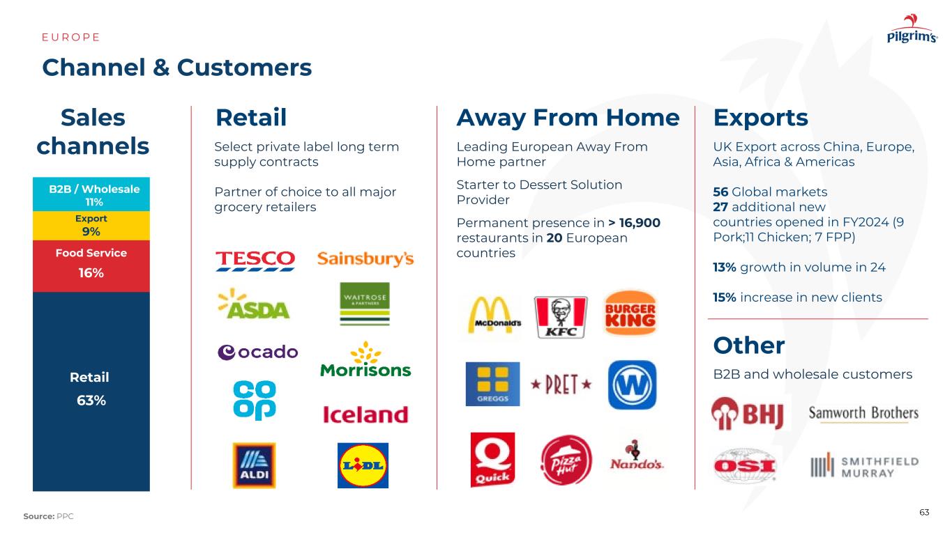业务类别&足迹E U R O P E 62来源:PPC全欧洲投资良好的生产网络英国23爱尔兰2法国3荷兰166% 23% 9%附加值新鲜出口其他收入按类别拆分2%综合商业模式涵盖家禽、猪肉和增值4个新鲜鸡肉设施5个新鲜猪肉和羊肉22个增值设施