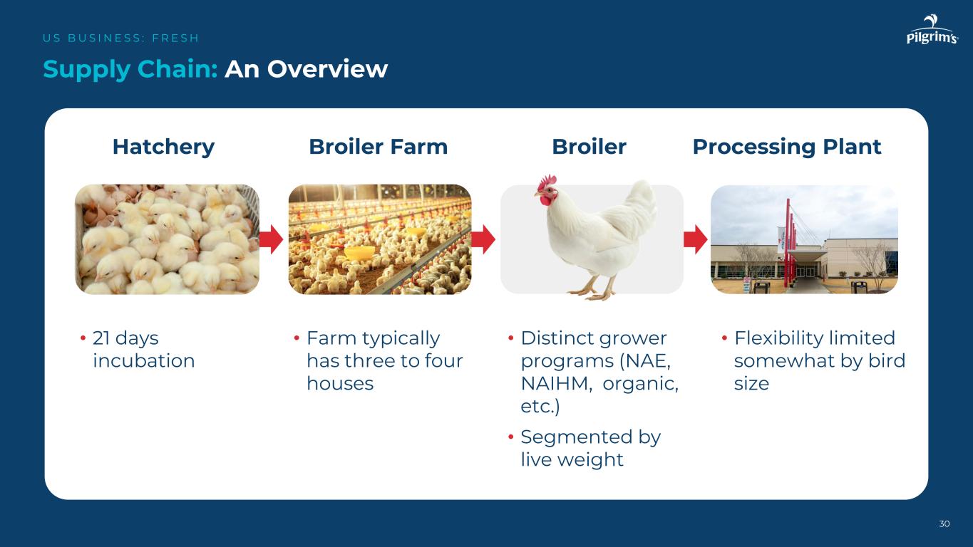 孵化场肉鸡养殖场加工植物肉鸡• 21天孵化•农场通常有三到四间房•不同的种植者计划(NAE、NAIHM、有机等)•按活重细分•灵活性受到鸟类大小供应链的一定限制:概述US B US I N E S S:F R E S H 30