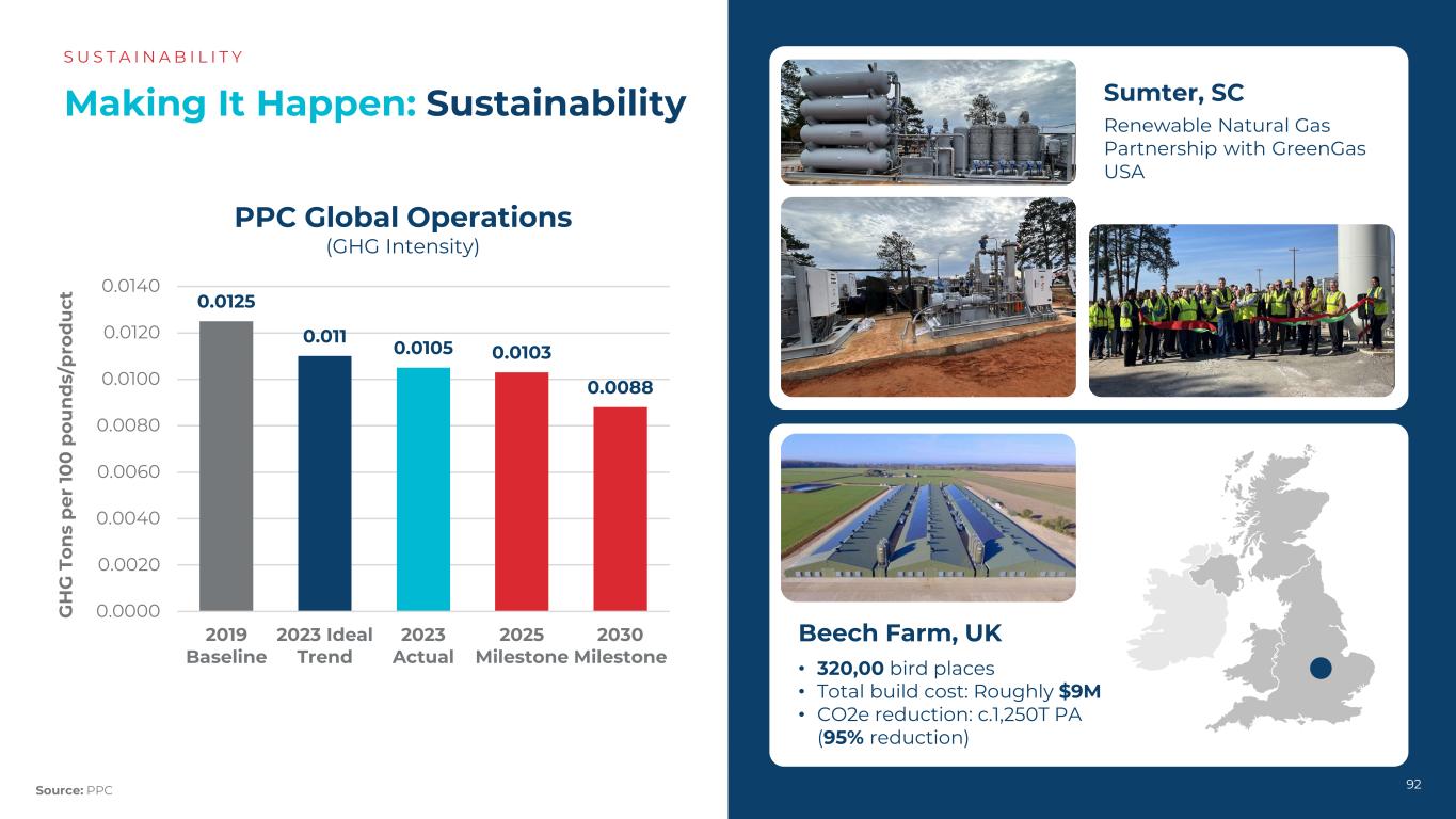 0.01 250.01 10.0 105 0.0 1030.00880.00000.00 200.00 400.00 600.00 800.0 1000.01 200.01 402019基线2023理想趋势2023实际2025年里程碑2030里程碑可再生天然气与GreenGas USA合作伙伴关系使其发生:可持续发展S US T A I N A B I L I T Y 92来源:PPC PPC全球运营(GHG强度)G H G T on s p er 100 p ou n d s/p ro d u ct • 320,00鸟位•总建造成本:约900万美元• CO2e减排量:约1,250t PA(减排量95%)Beech Farm,UK Sumter,SC