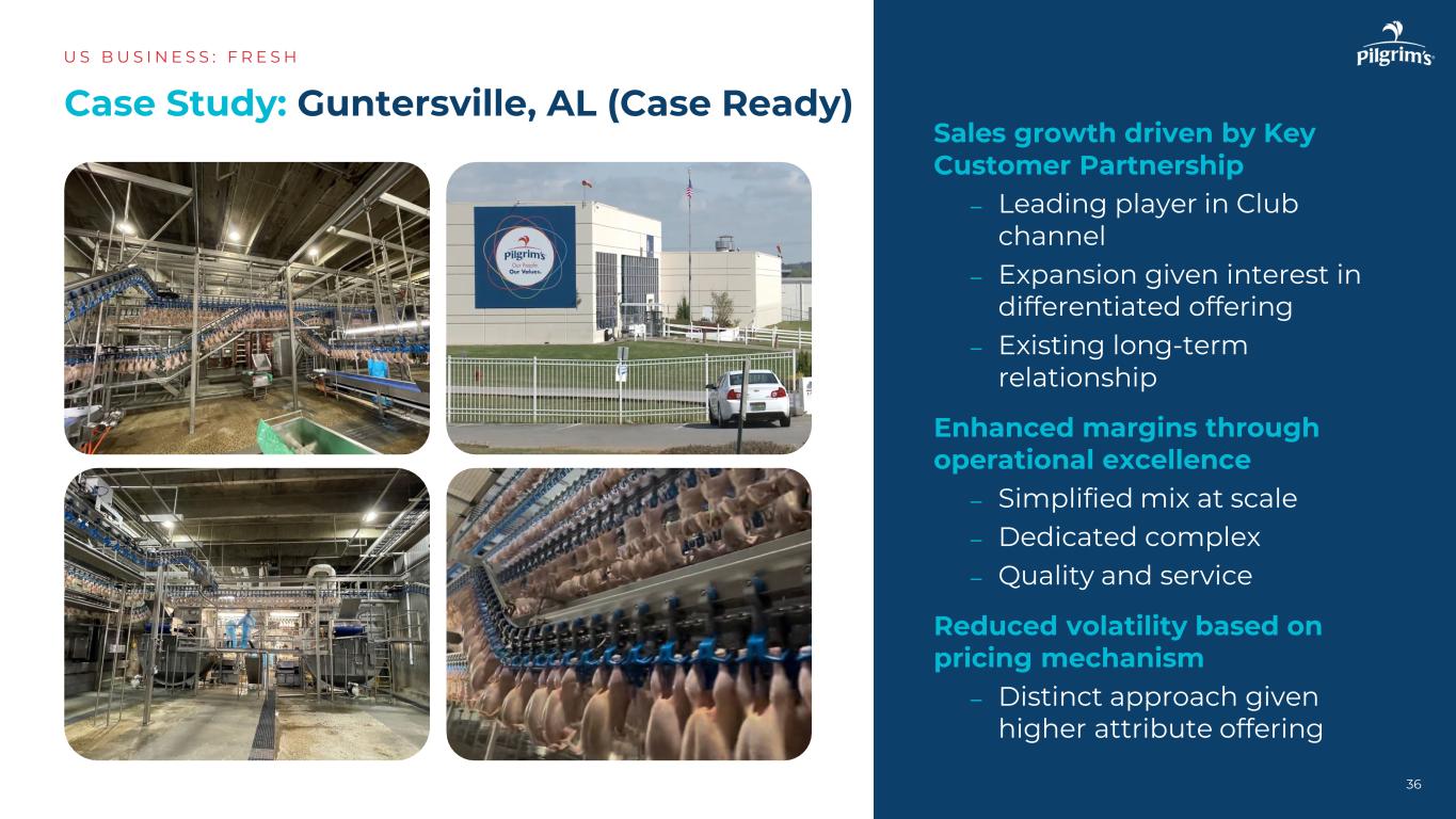 关键客户合作关系推动的销售增长–俱乐部渠道的领先玩家–由于对差异化产品感兴趣而进行扩张–现有的长期合作关系通过卓越运营提高利润率–规模上的简化组合–专用的综合体–基于定价机制的质量和服务降低了波动性–鉴于更高属性产品的不同方法案例研究:Guntersville,AL(Case Ready)US B US I N E S S:F R E S H 36
