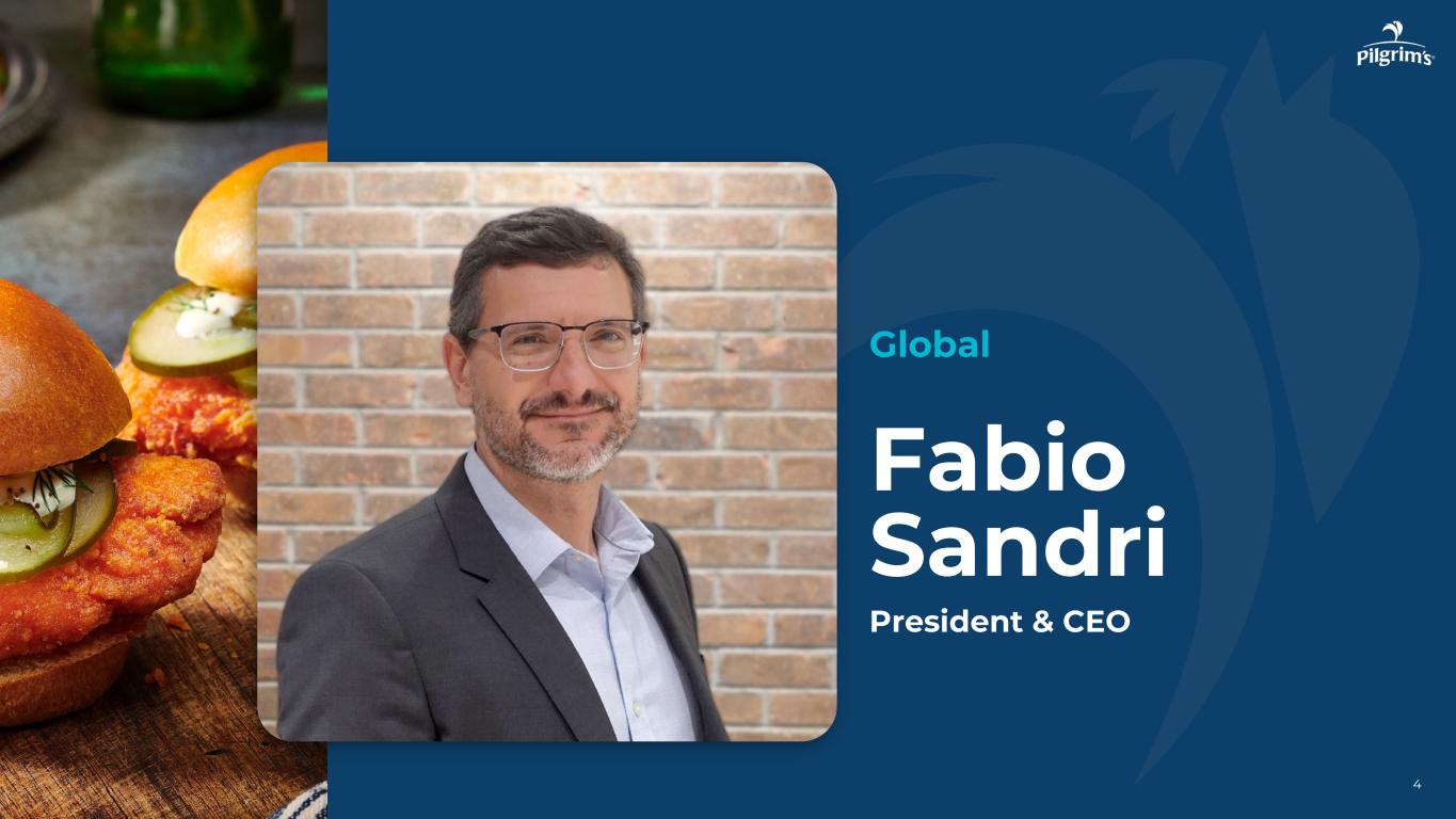 3 Today's Speakers I N V E S T O R D A Y Fabio Sandri Bernie Adcock Sergio Nahuz总裁兼首席执行官美国生鲜首席营销官兼预制食品负责人Ivan Siqueira Jesus Munoz Andrew Rojeski Matt Galvanoni总裁、Pilgrim欧洲总裁、Pilgrim墨西哥战略、投资者关系和可持续发展负责人首席财务官 Kendra Waldbusser FSQA和Live Tech Services负责人