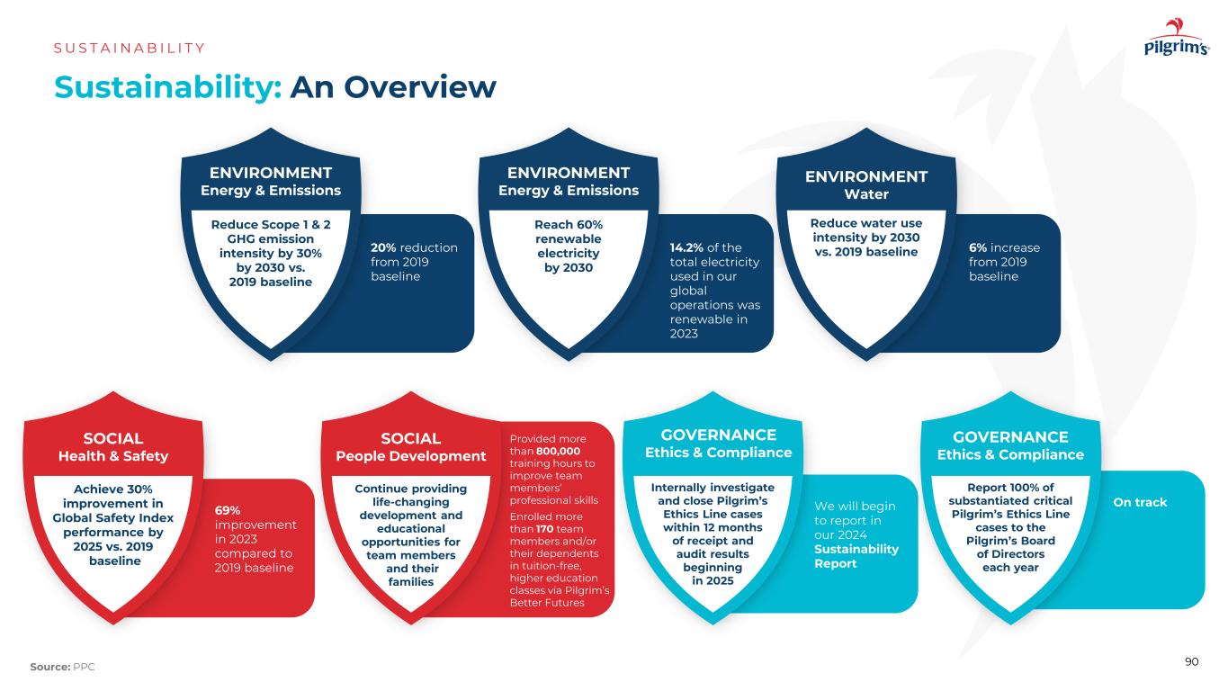 可持续性:概览S US T A I N A B I L I T Y 90来源:PPC社会健康与安全到2025年实现全球安全指数绩效提高30%,而2019年基线则为到2030年将范围1和2的GHG排放强度降低30%,而2019年基线则为到2030年将环境能源和排放达到60%可再生电力环境能源和排放环境水到2030年将用水强度比2019年基线降低20%与2019年基线相比2023年我们全球运营使用的总电力中14.2%为可再生能源6%比2019年基线增加69%与2019年基线相比,2023年有所改善社会人发展继续为团队成员及其家人提供改变生活的发展和教育机会提供了超过800,000个培训小时,以提高团队成员的专业技能,为170多名团队成员和/或其家属提供免学费,高等教育课程通过Pilgrim’s Better Futures Governance Ethics & Compliance内部调查并关闭Pilgrim’s Ethics Line案例从2025年开始在收到和审计结果后的12个月内我们将开始在我们的2024年可持续发展报告Governance Ethics & Compliance Report中每年向Pilgrim的董事会报告100%的经过证实的关键Pilgrim’s EAthics Line案例