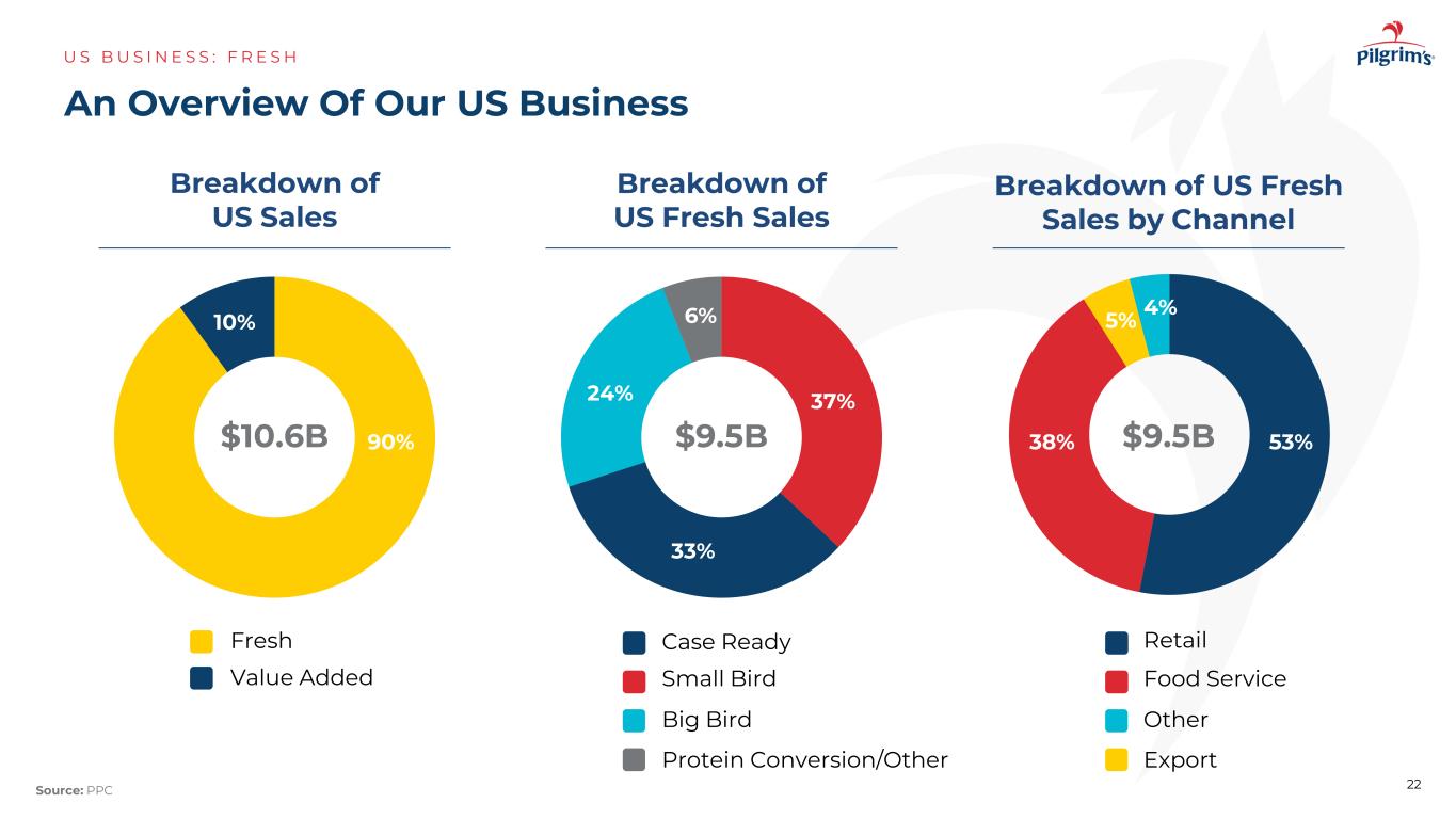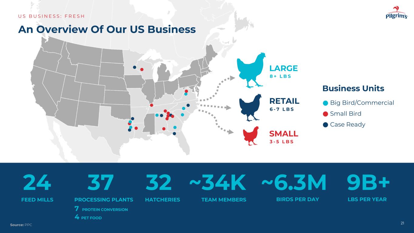 我们的美国业务概览US B US I N E S S:F R E S H21来源:PPC大型8 + L B S零售6-7 L B S小型3-5 L B S HATCHERIES 32团队成员~每天34k只鸟~6.3m饲料厂24个加工厂每年37磅9b +业务部门大鸟/商业小鸟案例准备就绪7蛋白质转化4宠物食品