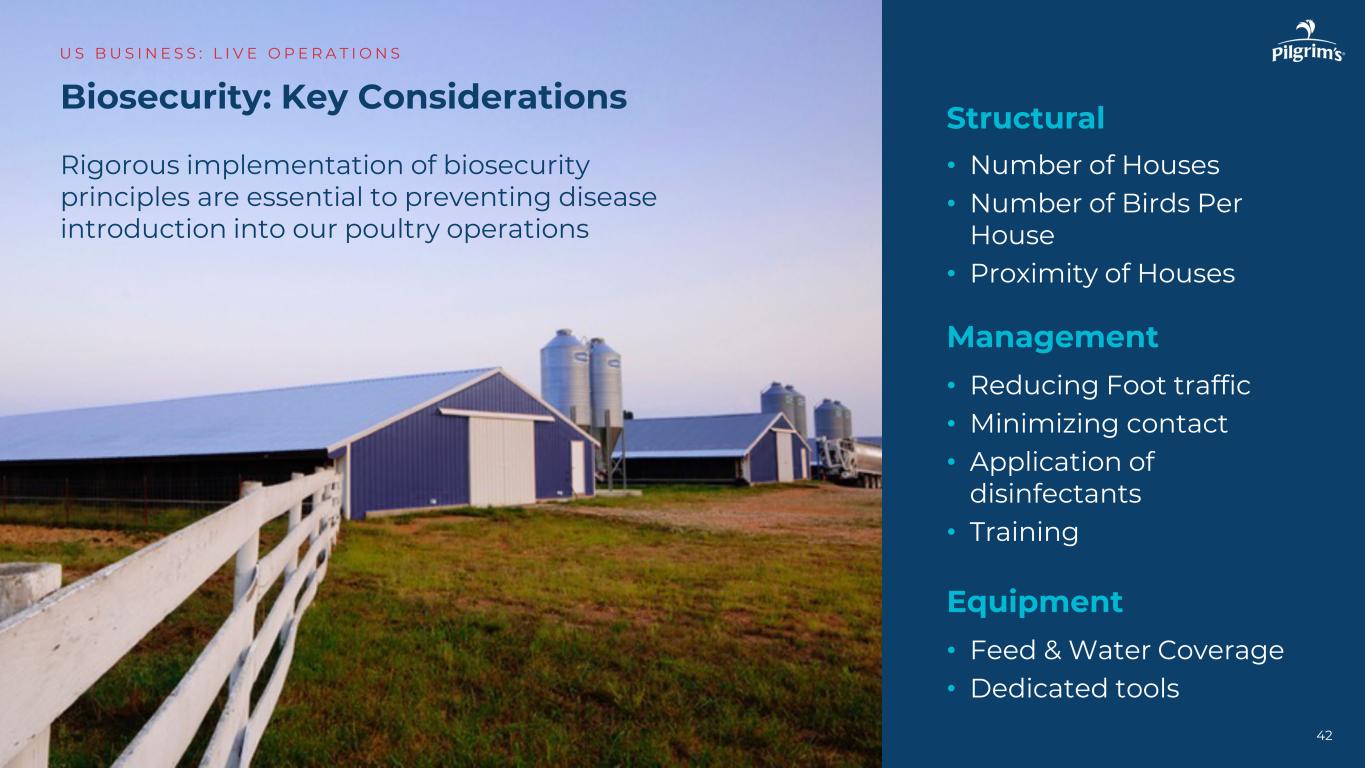 生物安全:关键考虑因素US B US I N E S:L I V E O P E R A T I O N S结构•房屋数量•每户鸟类数量•房屋管理的邻近性•减少人流量•尽量减少接触•应用消毒剂•培训设备•饲料和水覆盖•专用工具严格执行生物安全原则对于防止疾病引入我们的家禽业务至关重要42