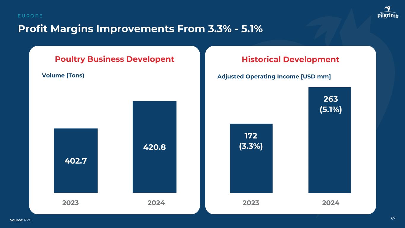 67利润率改善3.3%-5.1 % E U R O P E来源:PPC家禽业务开发量(吨)2023202420232024172(3.3%)263(5.1%)调整后营业收入[ USD m ]调整后营业收入[ USD mm ]历史发展5,2035,137402.74 20.8