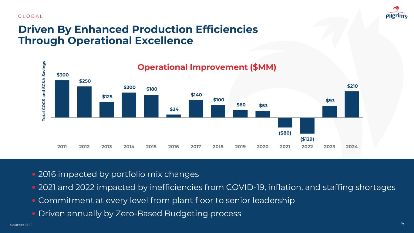 A多元化投资组合G L O B A L 13资料来源:PPC按地域划分的销售额按渠道划分的混合销售额29% 59% 12% 53% 33% 9% 5% 26% 74%墨西哥欧洲美国其他食品服务零售出口预制(增值)鲜