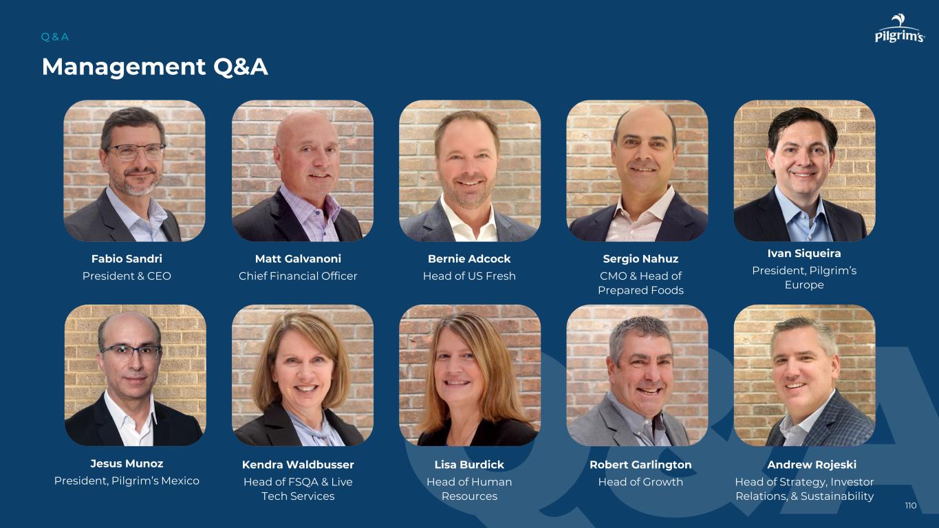 管理层问答问答Fabio Sandri Matt Galvanoni Bernie Adcock Sergio Nahuz总裁兼首席执行官首席财务官美国生鲜CMO主管兼预制食品主管Kendra Waldbusser Lisa Burdick Robert Garlington Andrew Rojeski FSQA和Live Tech Services主管人力资源主管战略、投资者关系和可持续发展增长主管110 Ivan Siqueira Pilgrim’s Europe总裁Jesus Munoz Pilgrim’s Mexico总裁