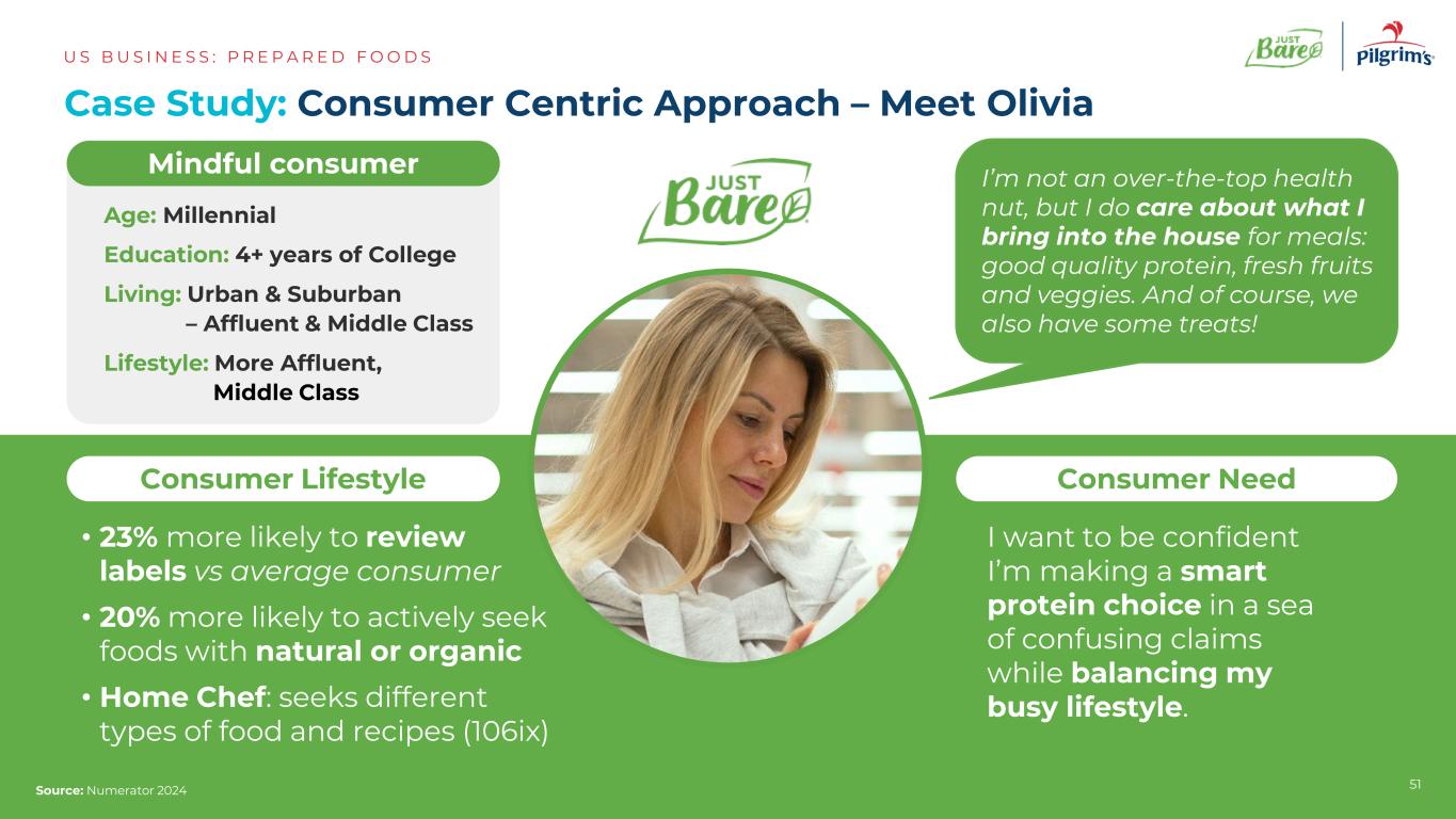 年龄:千禧一代学历:4 +年大学生活:城市&郊区–富裕&中产阶级生活方式:更富裕,中产阶级我不是一个过分的健康疯子,但我确实关心我带进家里吃饭的东西:优质蛋白质、新鲜水果和蔬菜。当然,我们也有一些请客!消费者生活方式•与普通消费者相比,审查标签的可能性增加23% •主动寻找天然或有机食物的可能性增加20% •家庭厨师:寻求不同类型的食物和食谱(106ix)消费者需求我希望确信我在混乱的声明中做出了明智的蛋白质选择,同时平衡了我忙碌的生活方式。案例研究:以消费者为中心的方法–认识Olivia US B US I N E S S:P R E P A R E D F O O D S来源:Numerator 202451 Mindful Consumer